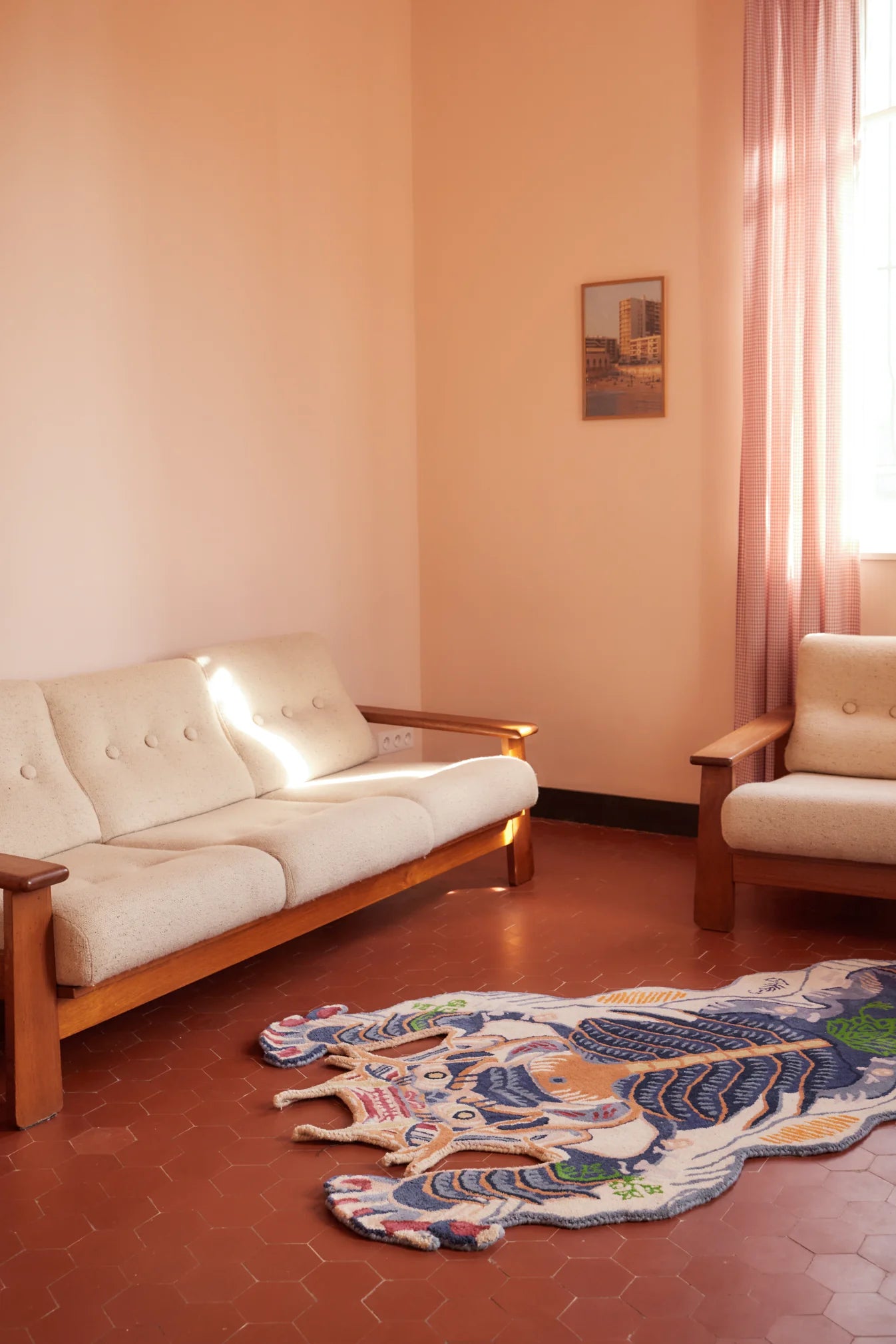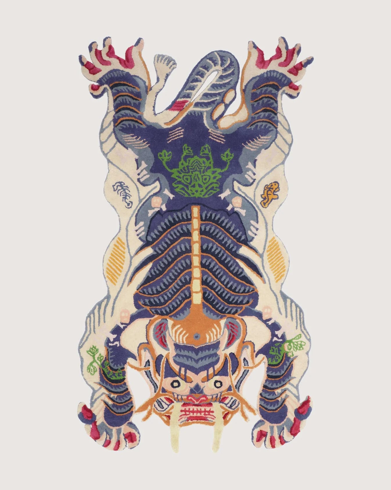 Mød Dragon Rug Small. Alle vores tæpper er lavet af uld i høj kvalitet og indeholder flere design detaljer. Hvert tæppe er håndvævet, ofte i legende former og nøje udvalgte farver. Læg det på gulvet eller hæng det på væggen – uanset hvad vil det bringe glæde og farve til din indretning.
