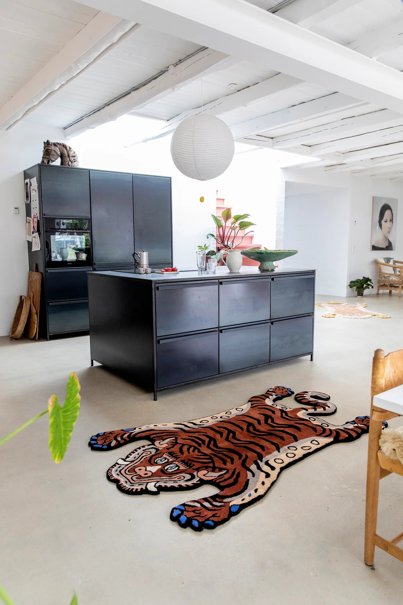 Mød Frankie Tiger Rug Large. Alle vores tæpper er lavet af uld i høj kvalitet og indeholder flere design detaljer. Hvert tæppe er håndvævet, ofte i legende former og nøje udvalgte farver. Læg det på gulvet eller hæng det på væggen – uanset hvad vil det bringe glæde og farve til din indretning.