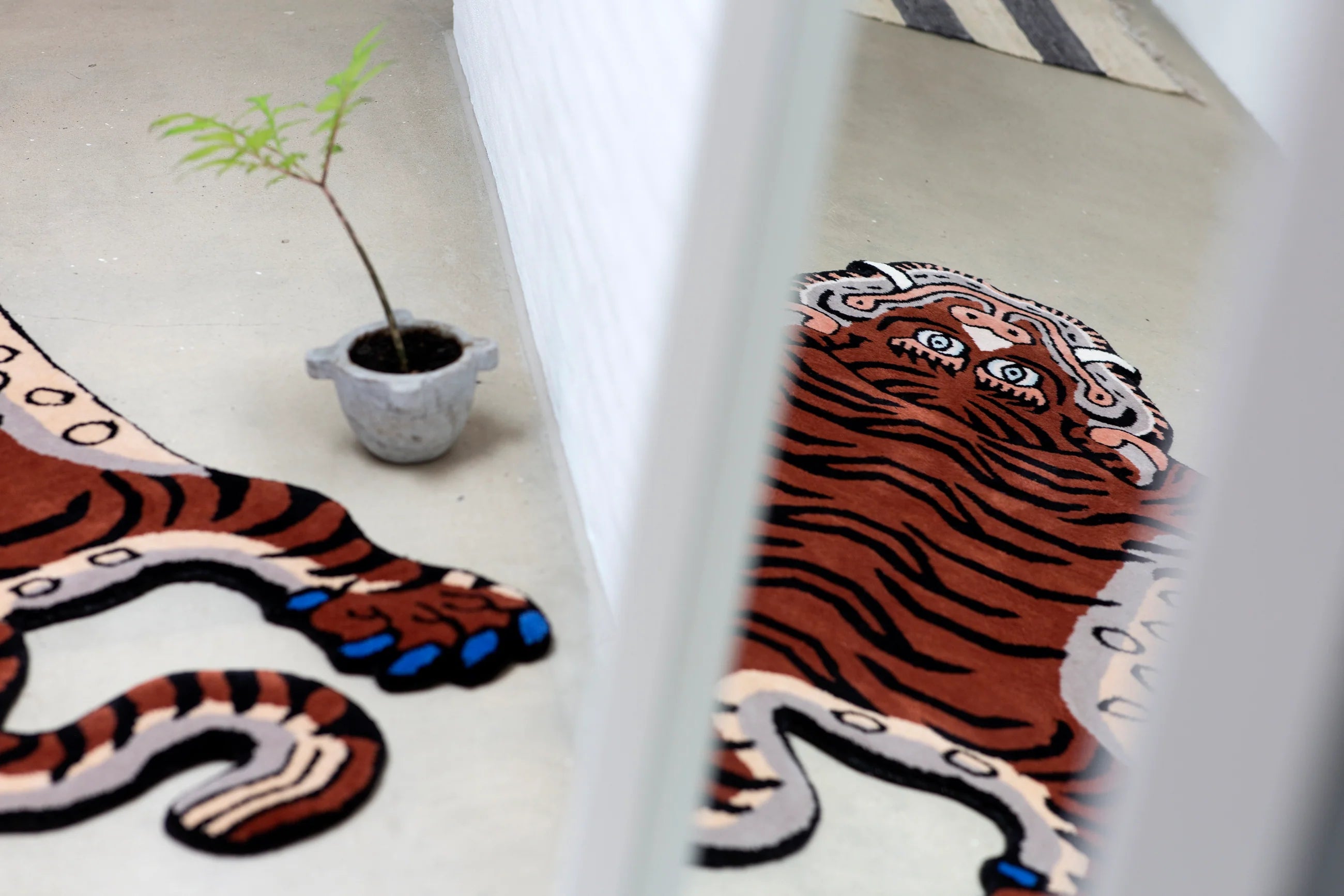 Mød Frankie Tiger Rug Large. Alle vores tæpper er lavet af uld i høj kvalitet og indeholder flere design detaljer. Hvert tæppe er håndvævet, ofte i legende former og nøje udvalgte farver. Læg det på gulvet eller hæng det på væggen – uanset hvad vil det bringe glæde og farve til din indretning.