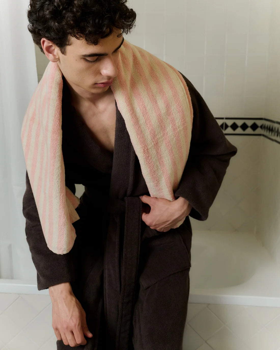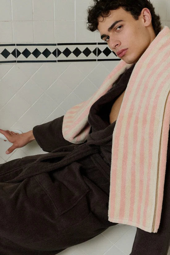 Giv dig selv et blødt kram med vores Naram Bathrobe. Forlæng dit baderitual og de hyggelige morgener med et klassisk design, fine farver og tidløse striber. Badekåben kommer med sjalskrave, åben front, bæltelukning og to rummelige lommer.