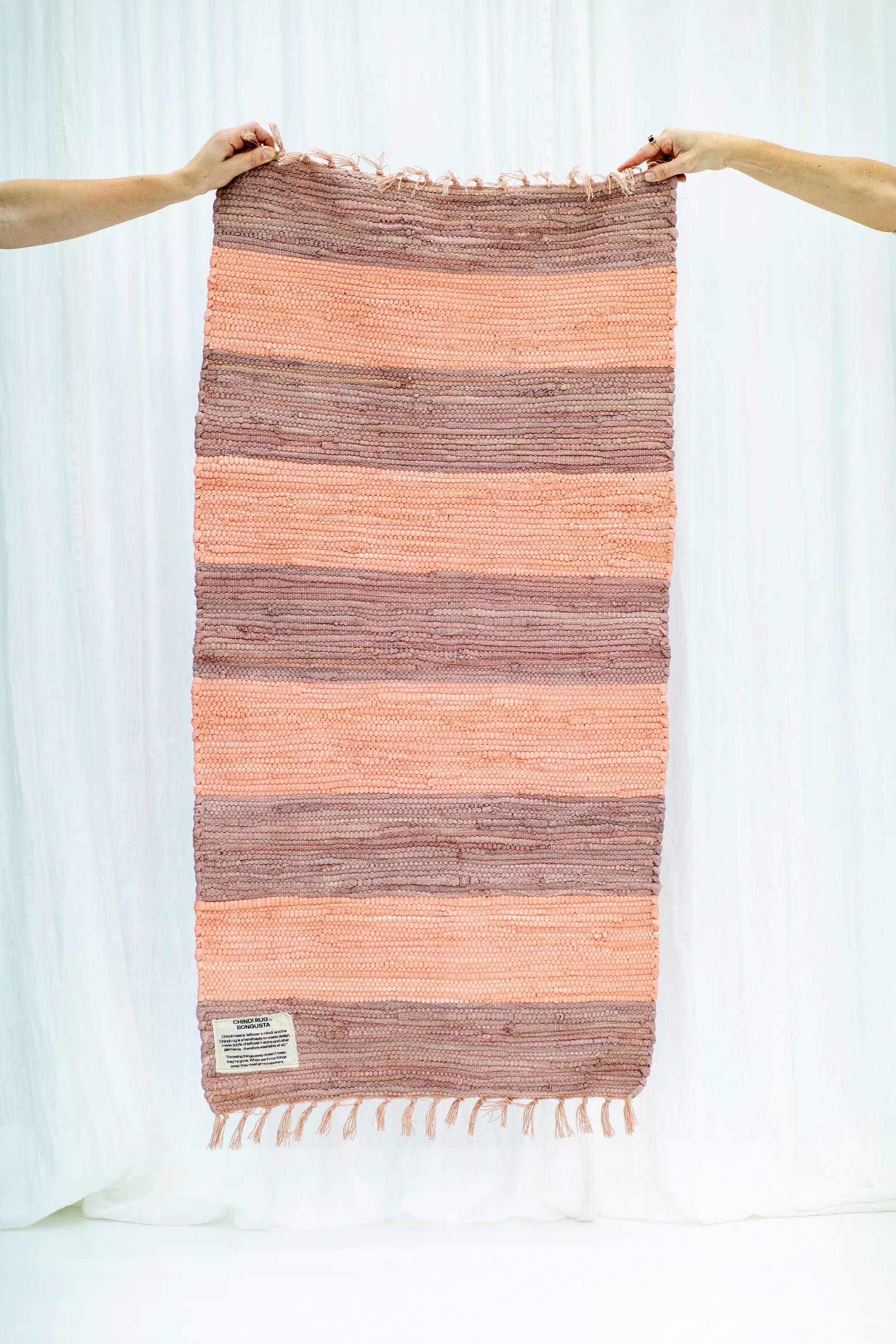 Afledt af Hindi-udtrykket Chindi, der betyder "rester", er dette tæppe håndvævet af genanvendte bomulds t-shirts og tøjrester. Hver enkelt tråd giver nyt liv til kasseret tøj ved at forvandle det til et dekorativt tæppe.