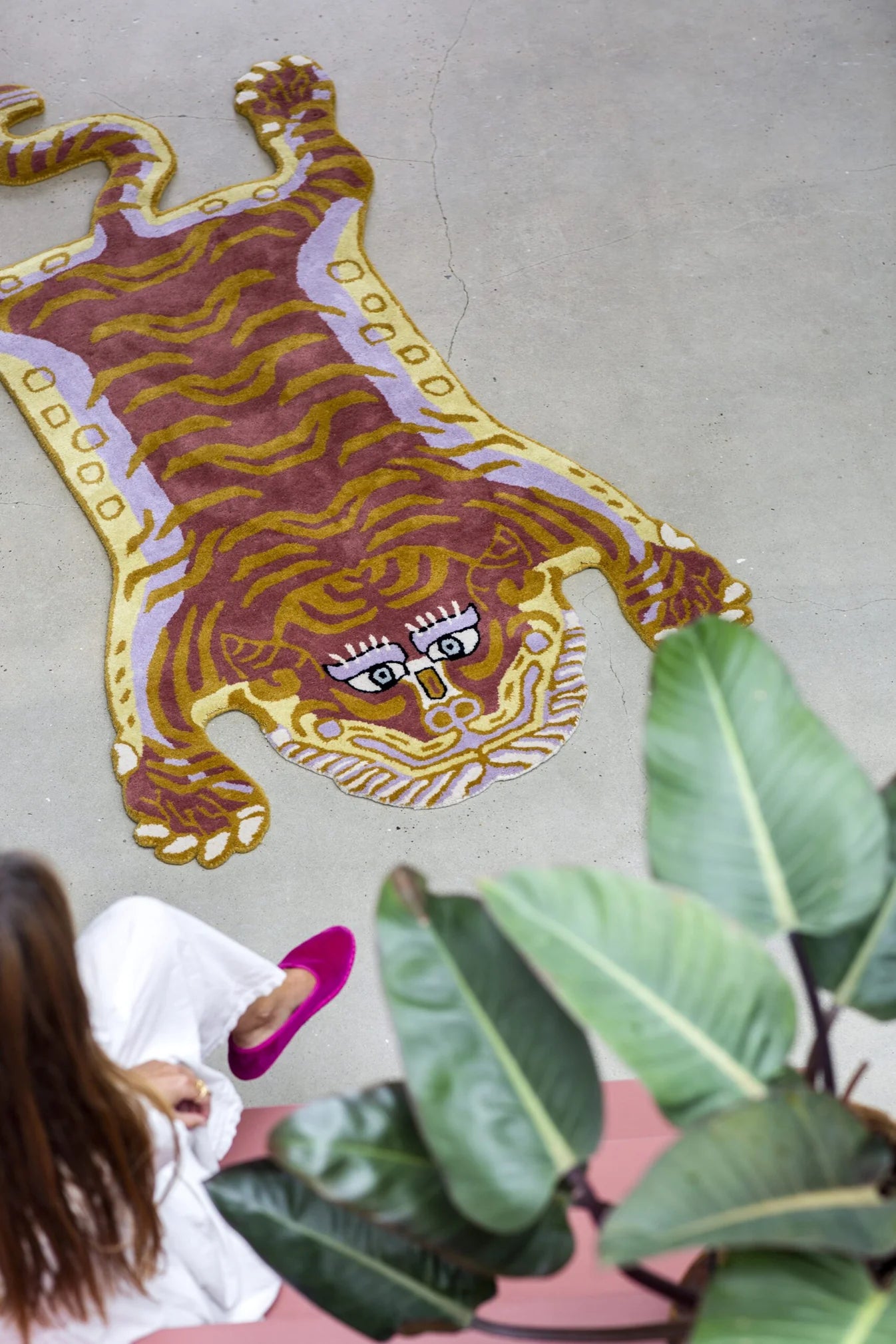 Mød Tigress Rug Small. Alle vores tæpper er lavet af uld i høj kvalitet og indeholder flere design detaljer. Hvert tæppe er håndvævet, ofte i legende former og nøje udvalgte farver. Læg det på gulvet eller hæng det på væggen – uanset hvad vil det bringe glæde og farve til din indretning.