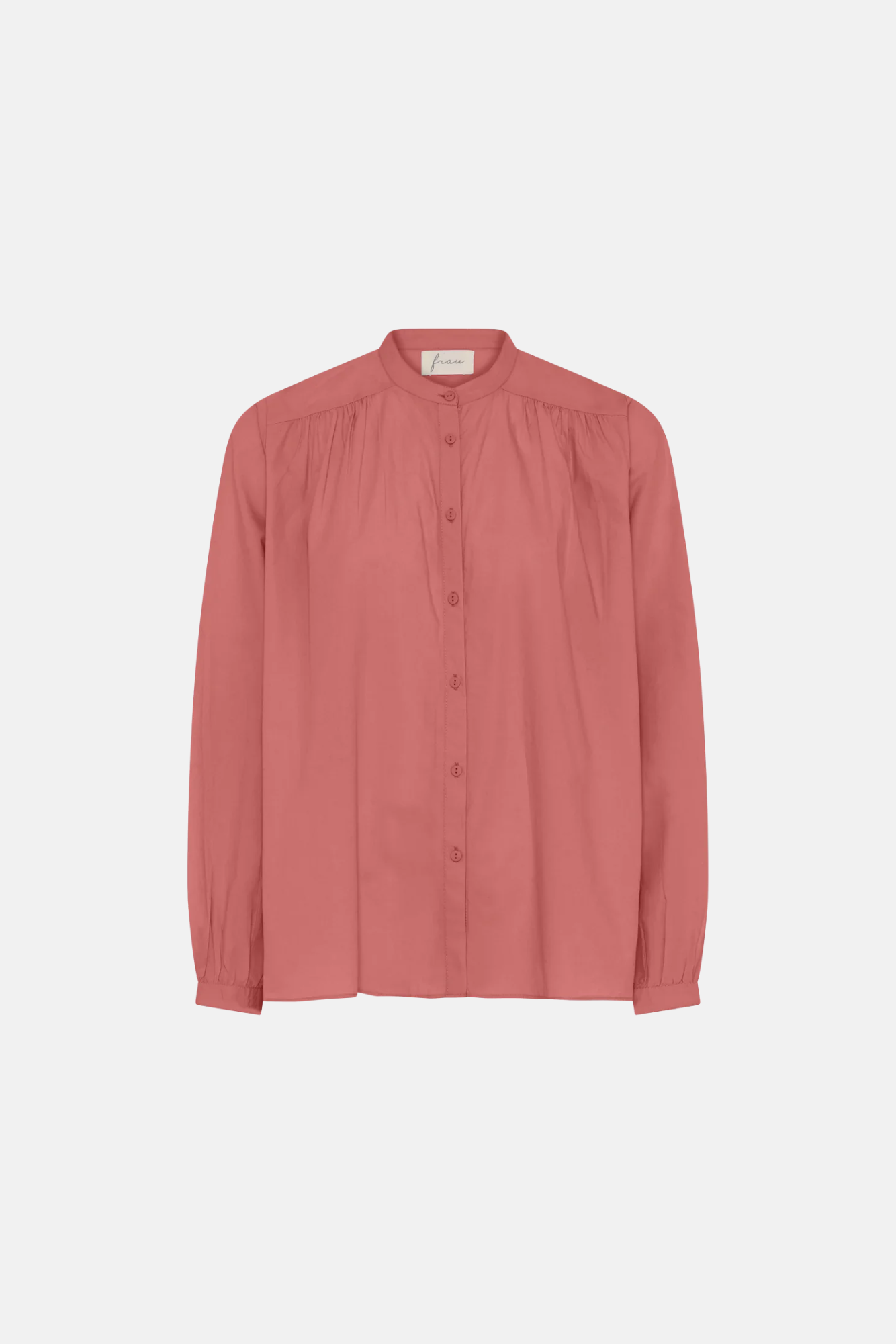 Florence skjorte har lange ærmer, kinakrave og feminine rynker ved skulderskæringen og på ryggen. Ved ærmerne har den også lidt feminint rynk.