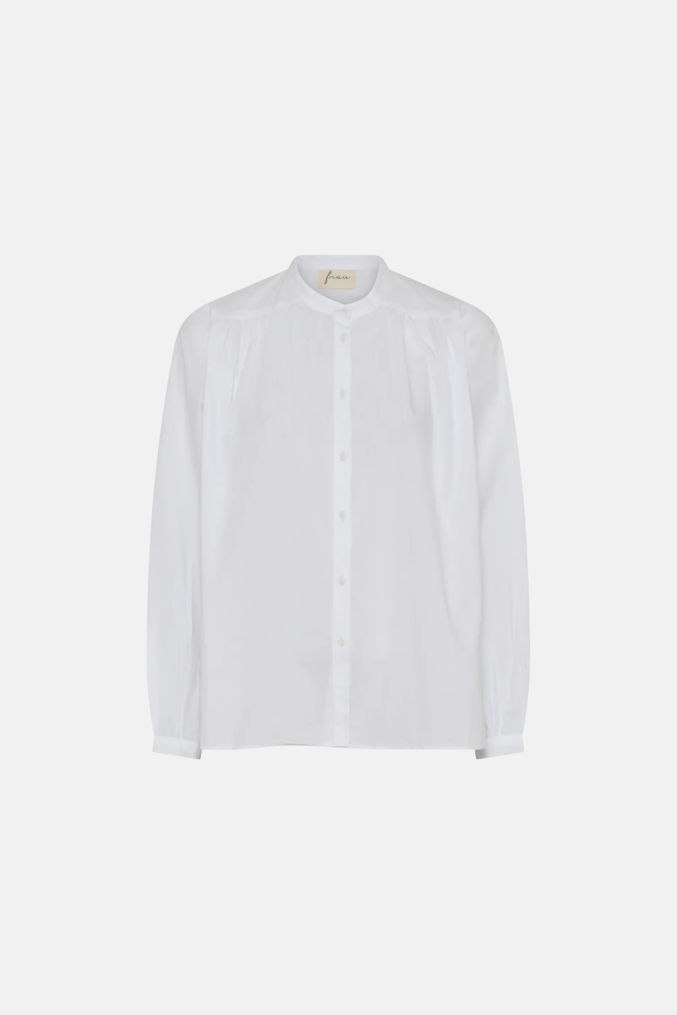 Florence skjorte har lange ærmer, kinakrave og feminine rynker ved skulderskæringen og på ryggen. Ved ærmerne har den også lidt feminint rynk.