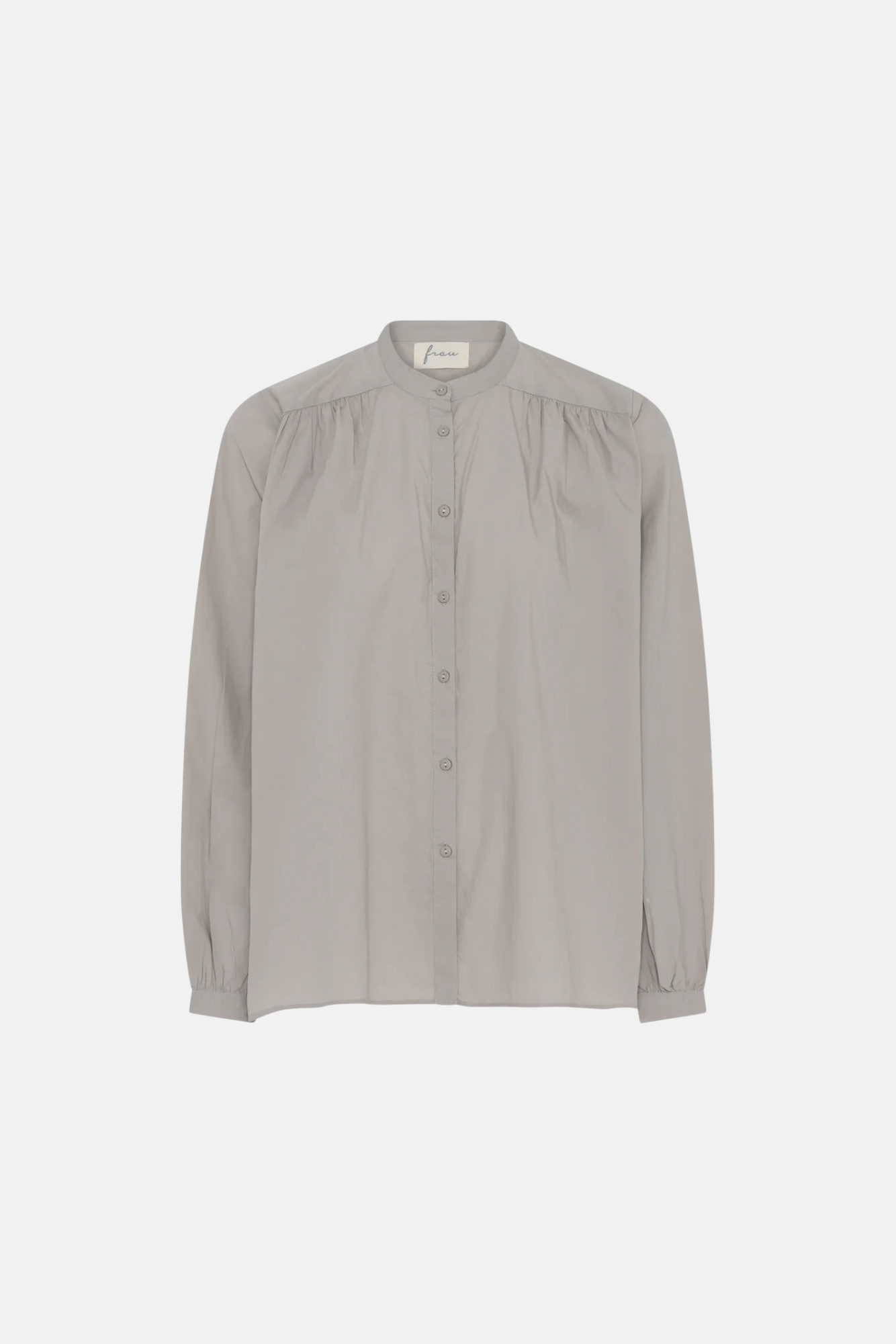 Florence skjorte har lange ærmer, kinakrave og feminine rynker ved skulderskæringen og på ryggen. Ved ærmerne har den også lidt feminint rynk.