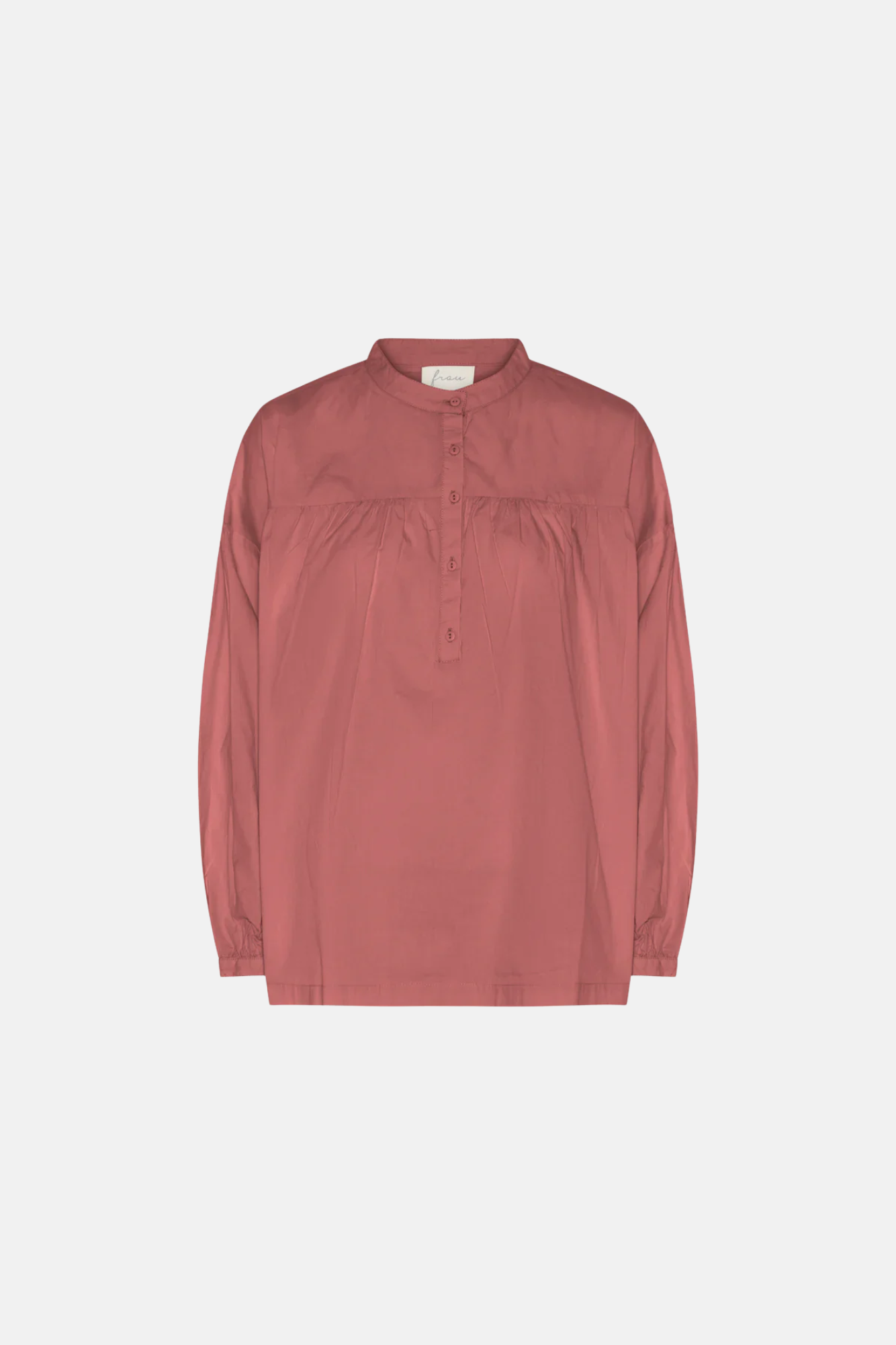 Paris Skjorte har lange ærmer, kinakrave og feminine rynker på skæringen hen over brystet og ryggen. Ved ærmerne har den også et feminint rynk.