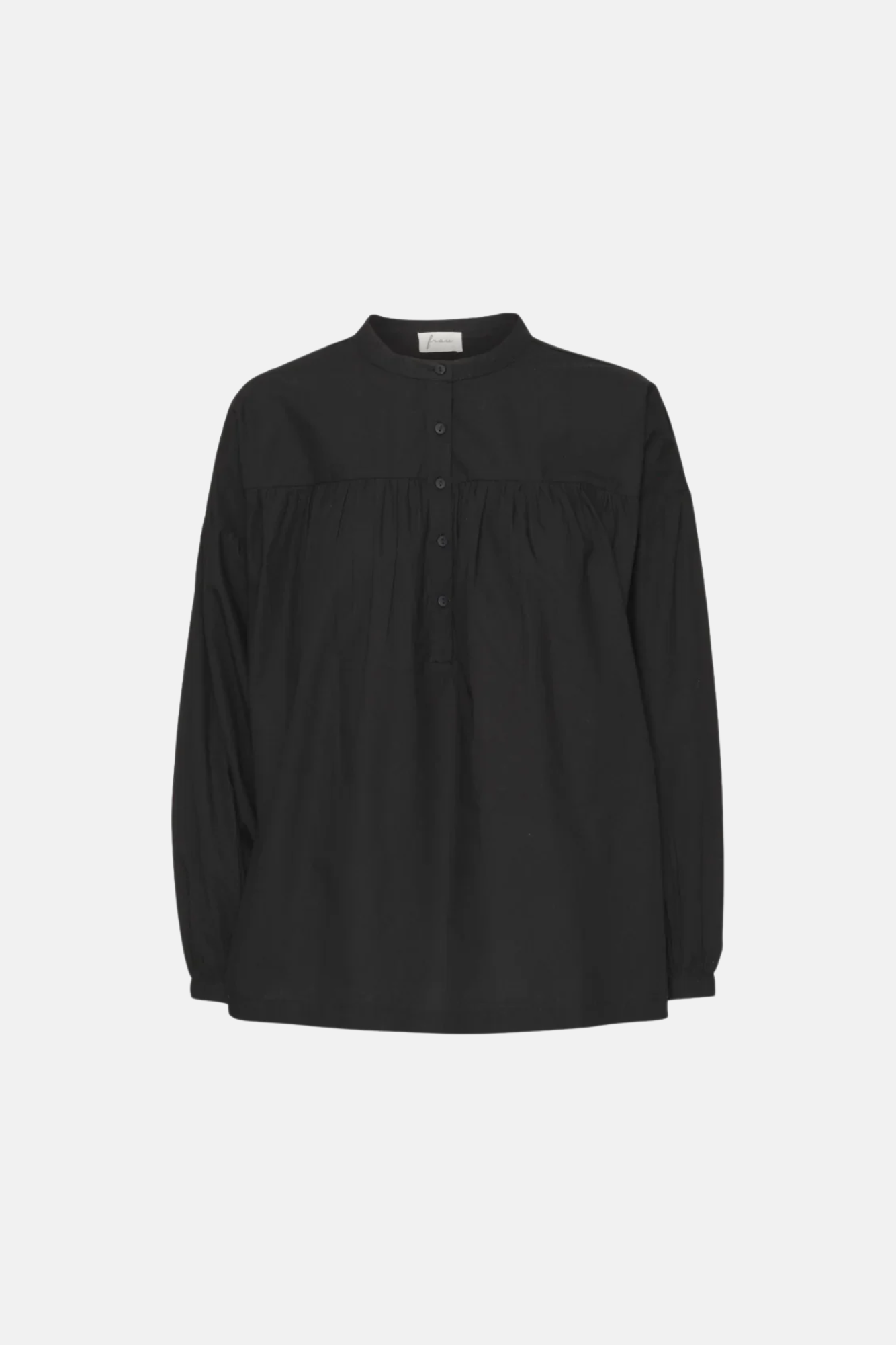 Paris Skjorte har lange ærmer, kinakrave og feminine rynker på skæringen hen over brystet og ryggen. Ved ærmerne har den også et feminint rynk.