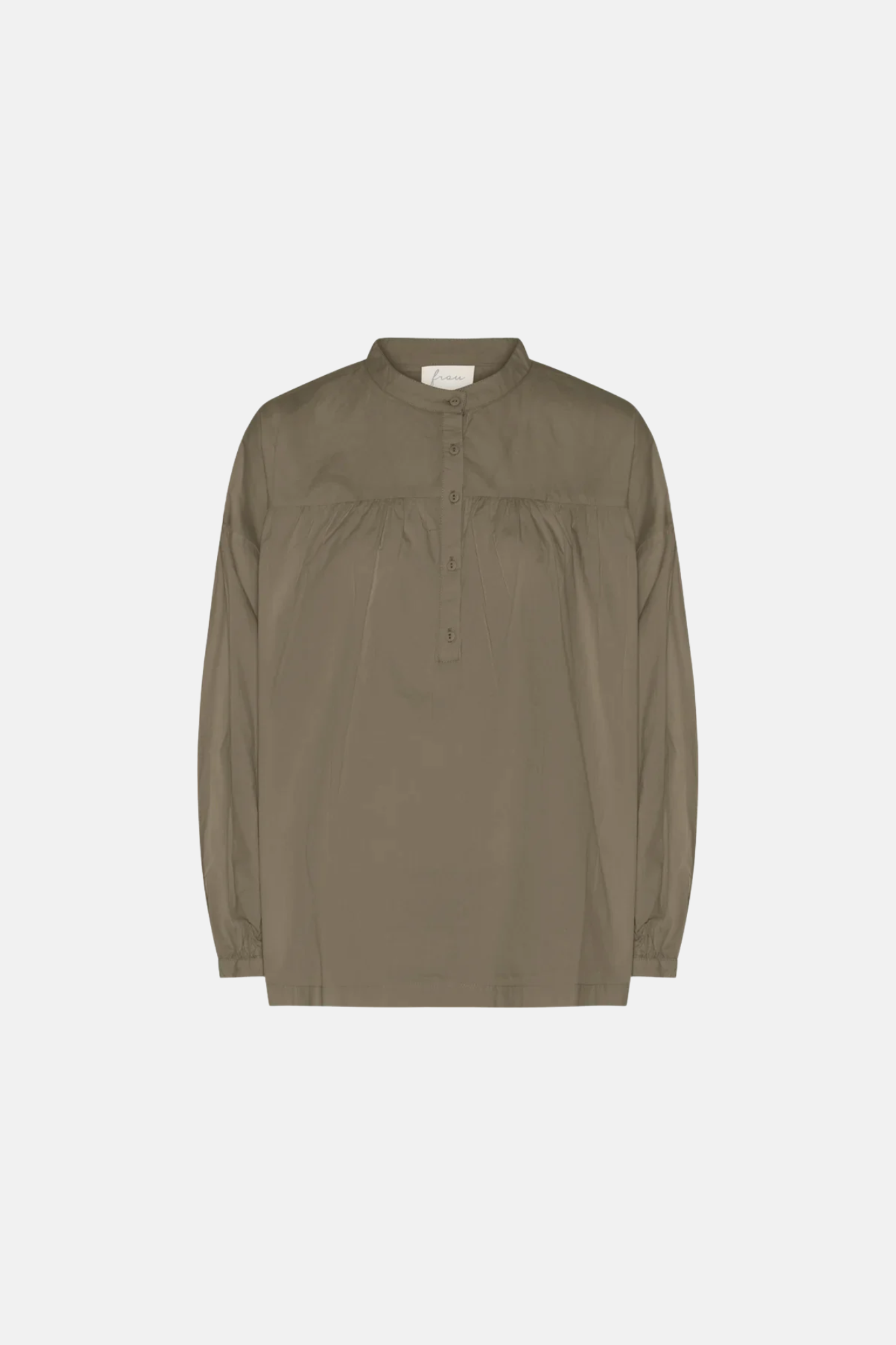 Paris Skjorte har lange ærmer, kinakrave og feminine rynker på skæringen hen over brystet og ryggen. Ved ærmerne har den også et feminint rynk.