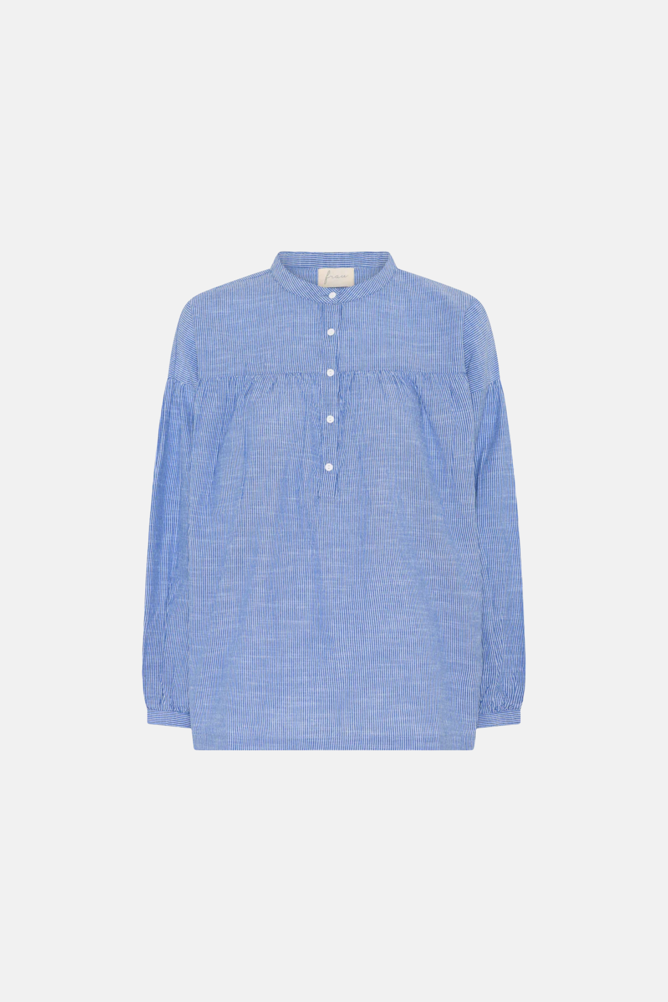 Paris Skjorte har lange ærmer, kinakrave og feminine rynker på skæringen hen over brystet og ryggen. Ved ærmerne har den også et feminint rynk.
