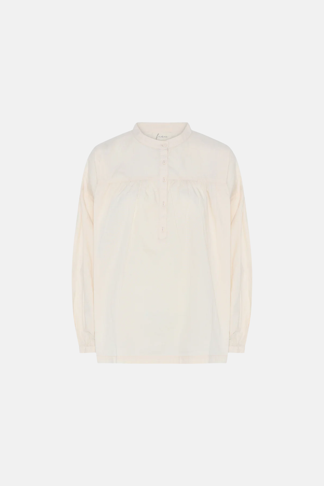 Paris Skjorte har lange ærmer, kinakrave og feminine rynker på skæringen hen over brystet og ryggen. Ved ærmerne har den også et feminint rynk.