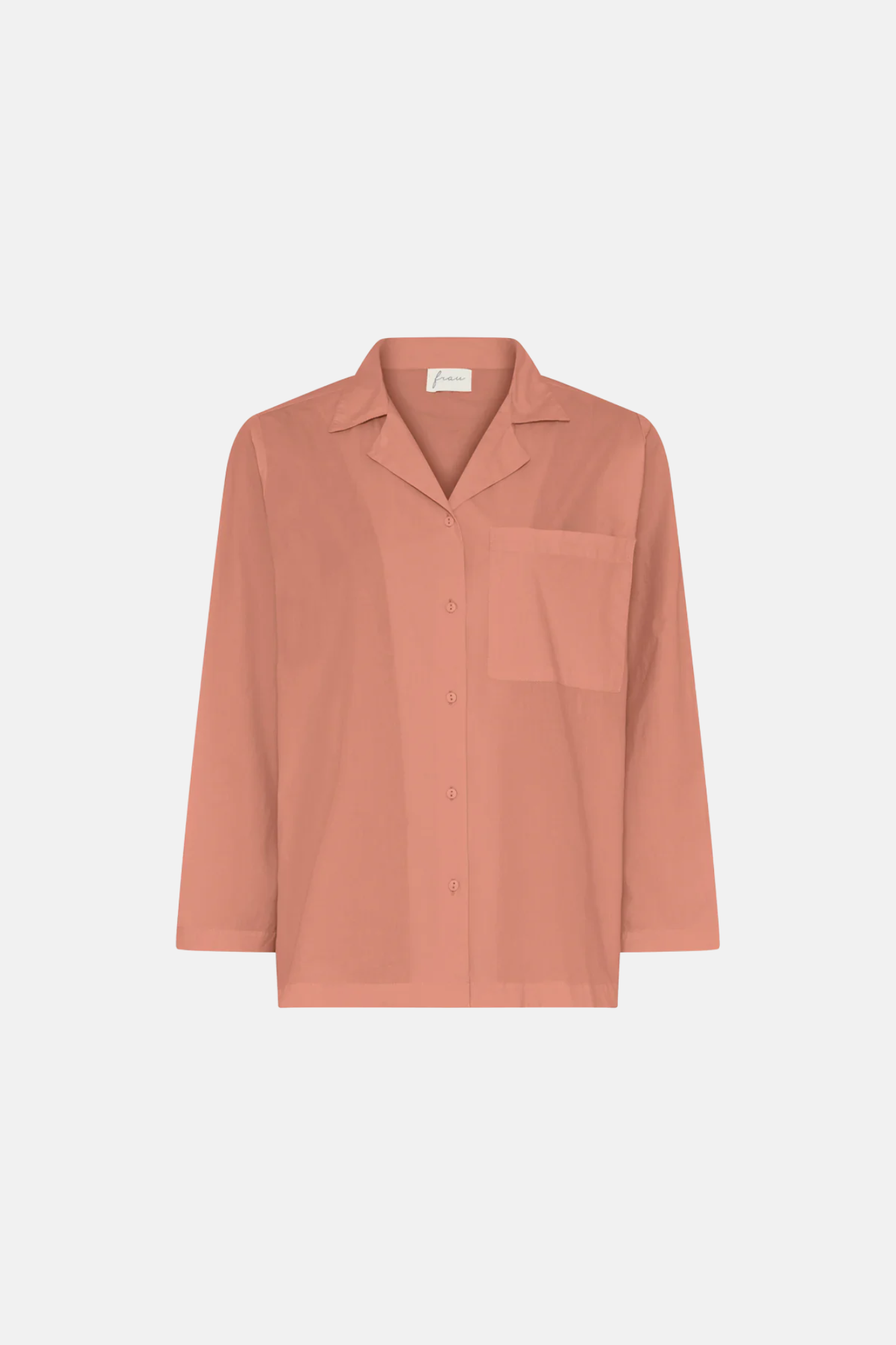 Seattle Skjorte er en enkel og pyjamas-inspireret skjorte med en lille krave. Skjorten har lige ærmer og knaplukning foran.