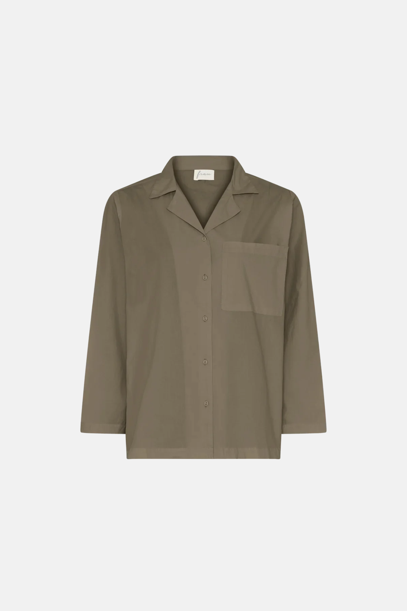 Seattle Skjorte er en enkel og pyjamas-inspireret skjorte med en lille krave. Skjorten har lige ærmer og knaplukning foran.