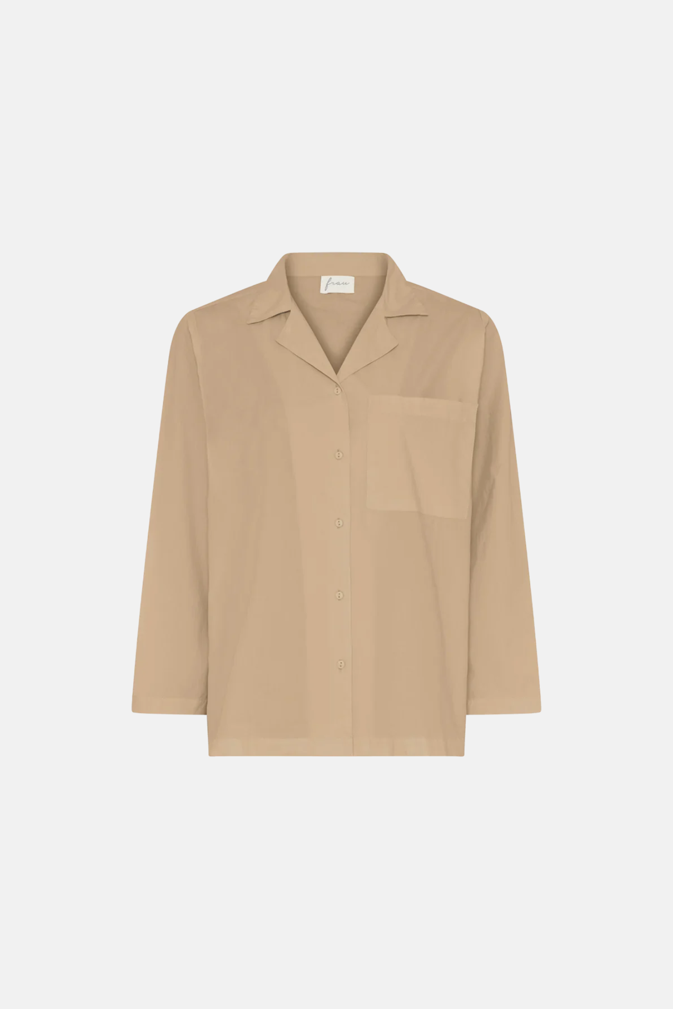 Seattle Skjorte er en enkel og pyjamas-inspireret skjorte med en lille krave. Skjorten har lige ærmer og knaplukning foran.
