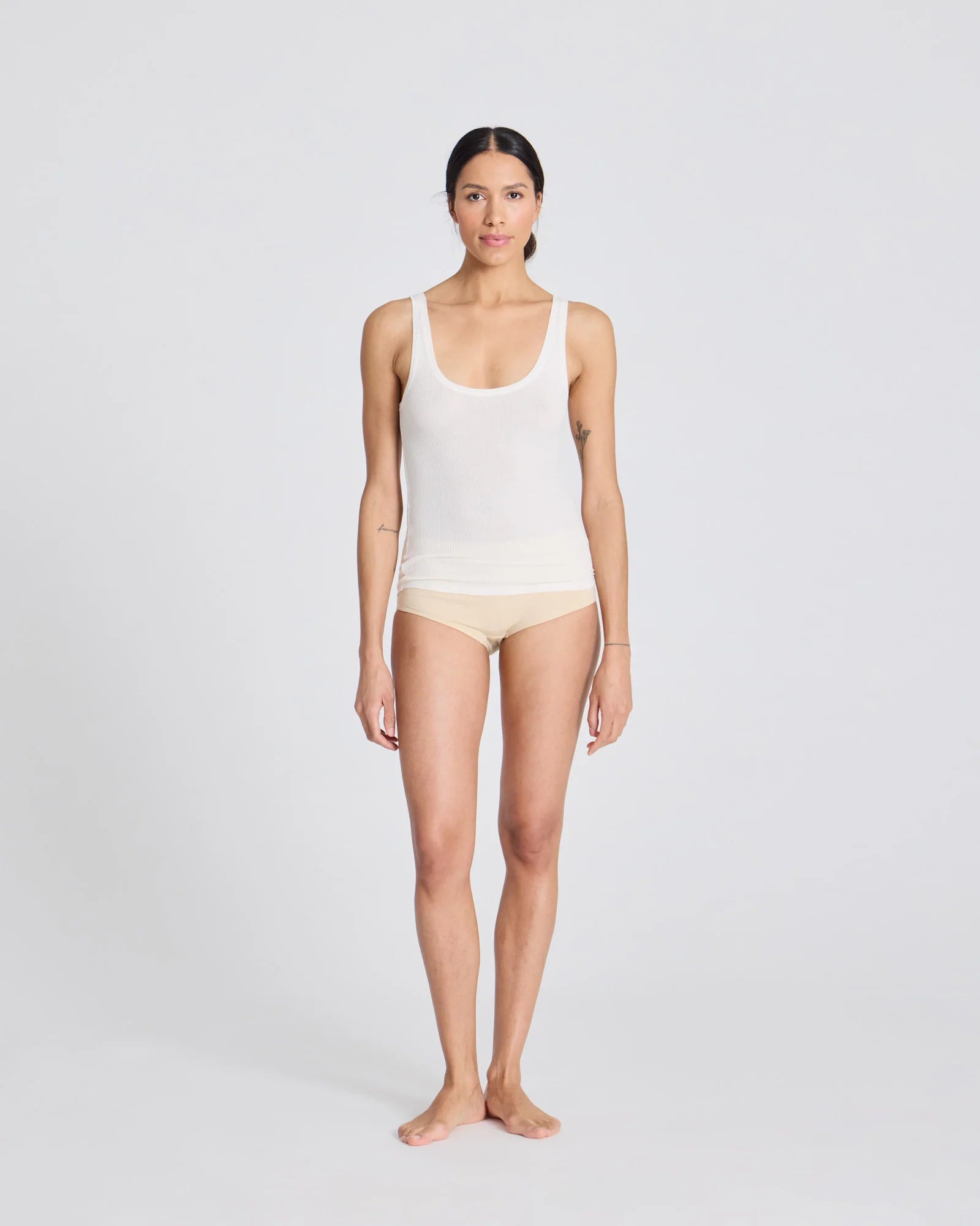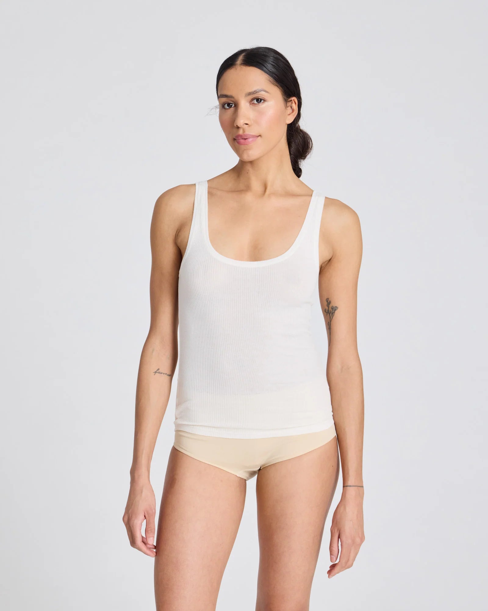 Beate er en top, som er lavet af 100% økologisk bomuld. Toppen har en dyb, rund halsudskæring og er lavet i en 3x2 ribkvalitet. Beate Top har kurvet søm og er længere bagpå end foran.