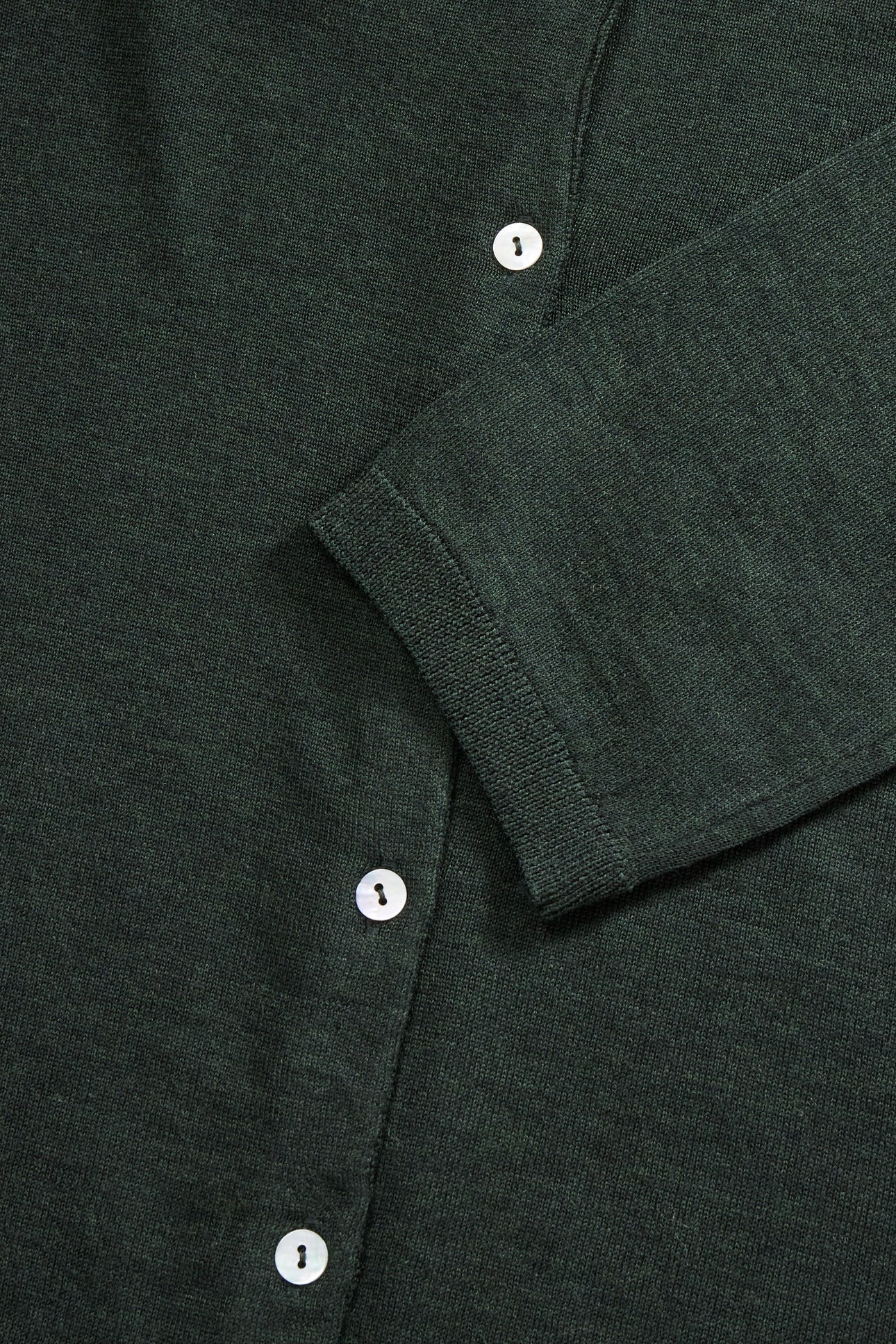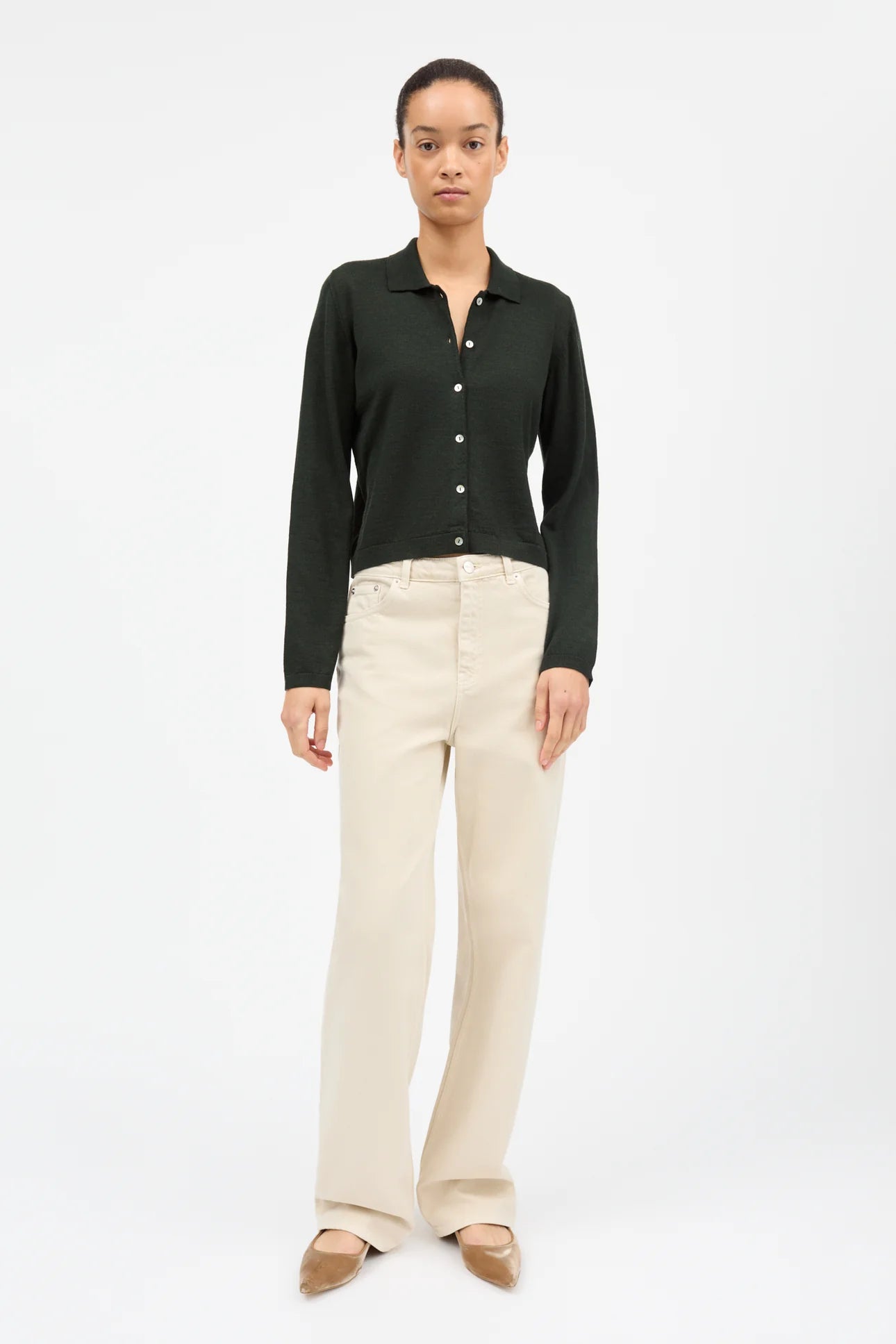 Amethyst Cardigan er en klassisk cardigan med polo-inspireret krave, strikket i let merinould. Den har let sænkede skuldre og lukkes foran med seks perlemorsknapper.