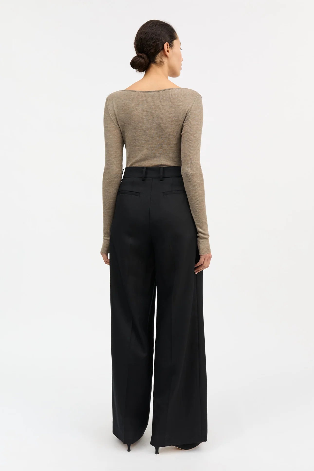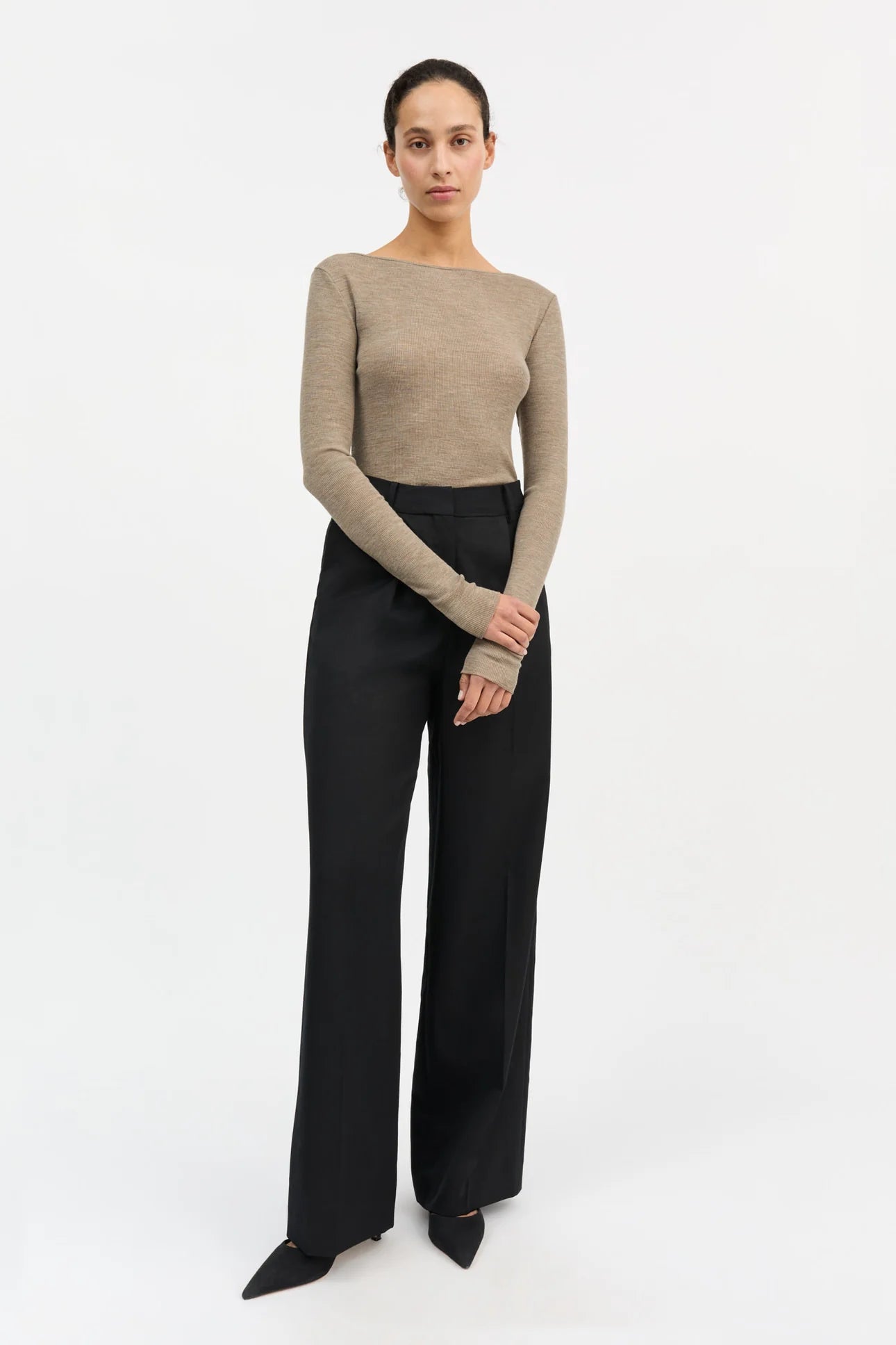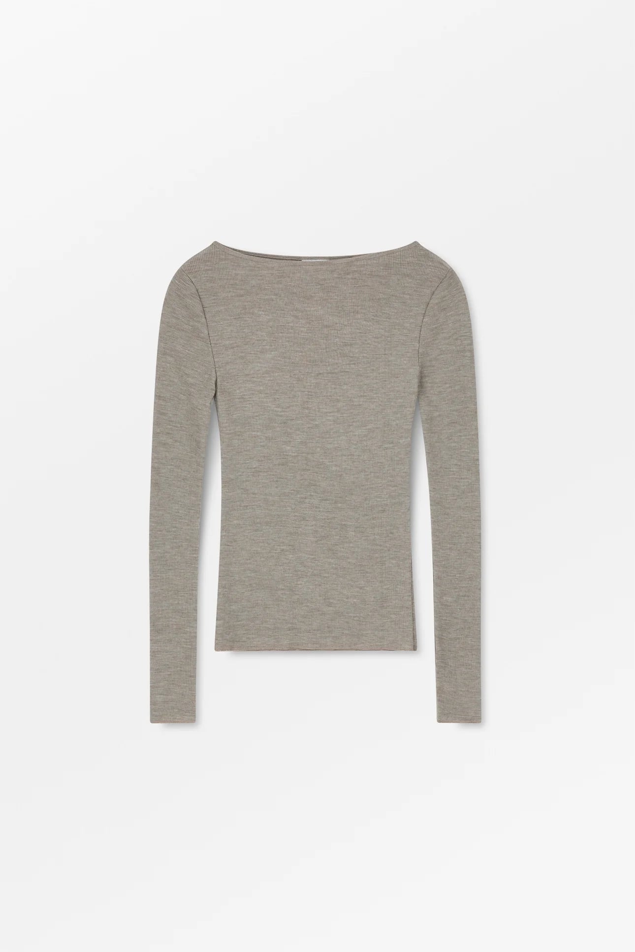 Amy Wide Neck Blouse er en tætsiddende ribstrikket bluse i 100% økologisk merinould. Den har en bred bådudskæring, lange smalle ærmer, og sømmene er afsluttet med fine babylock-syninger.
