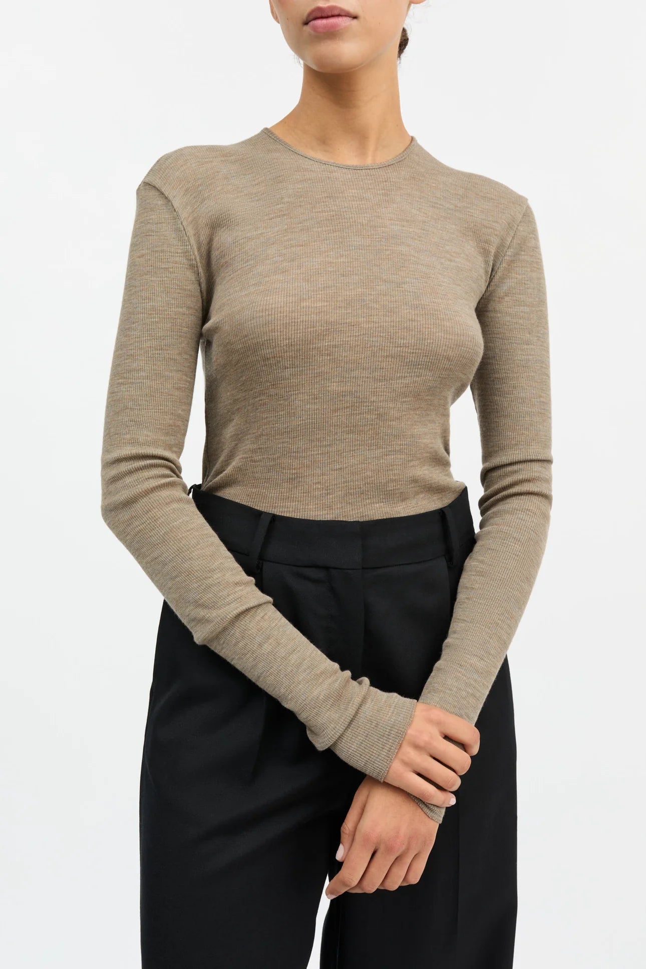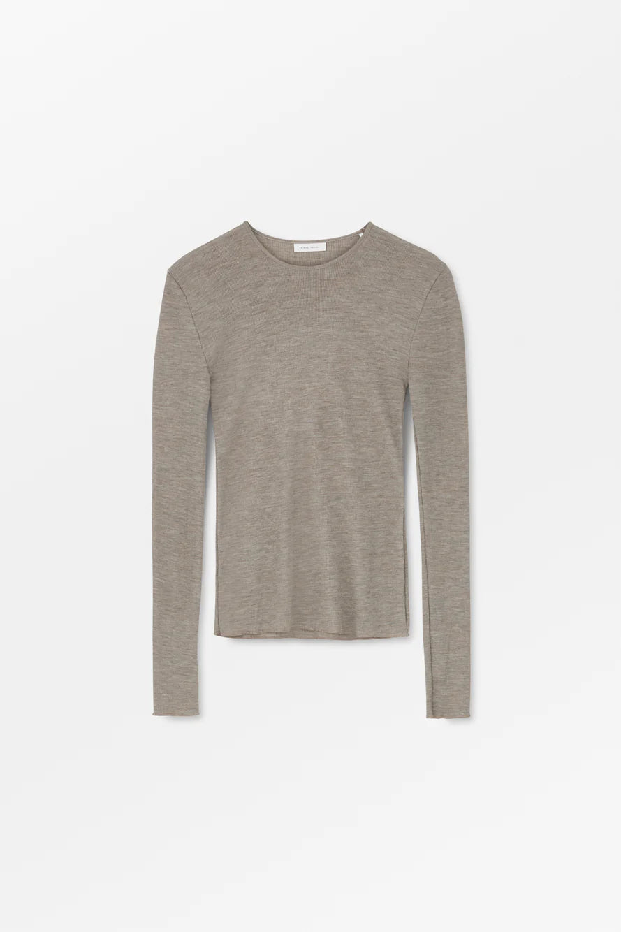 Amy O-neck Blouse er en tætsiddende ribstrikket bluse i 100% økologisk merinould med rund hals og lange ærmer. Detaljerede babylock-syninger giver en fin afslutning på sømmene.