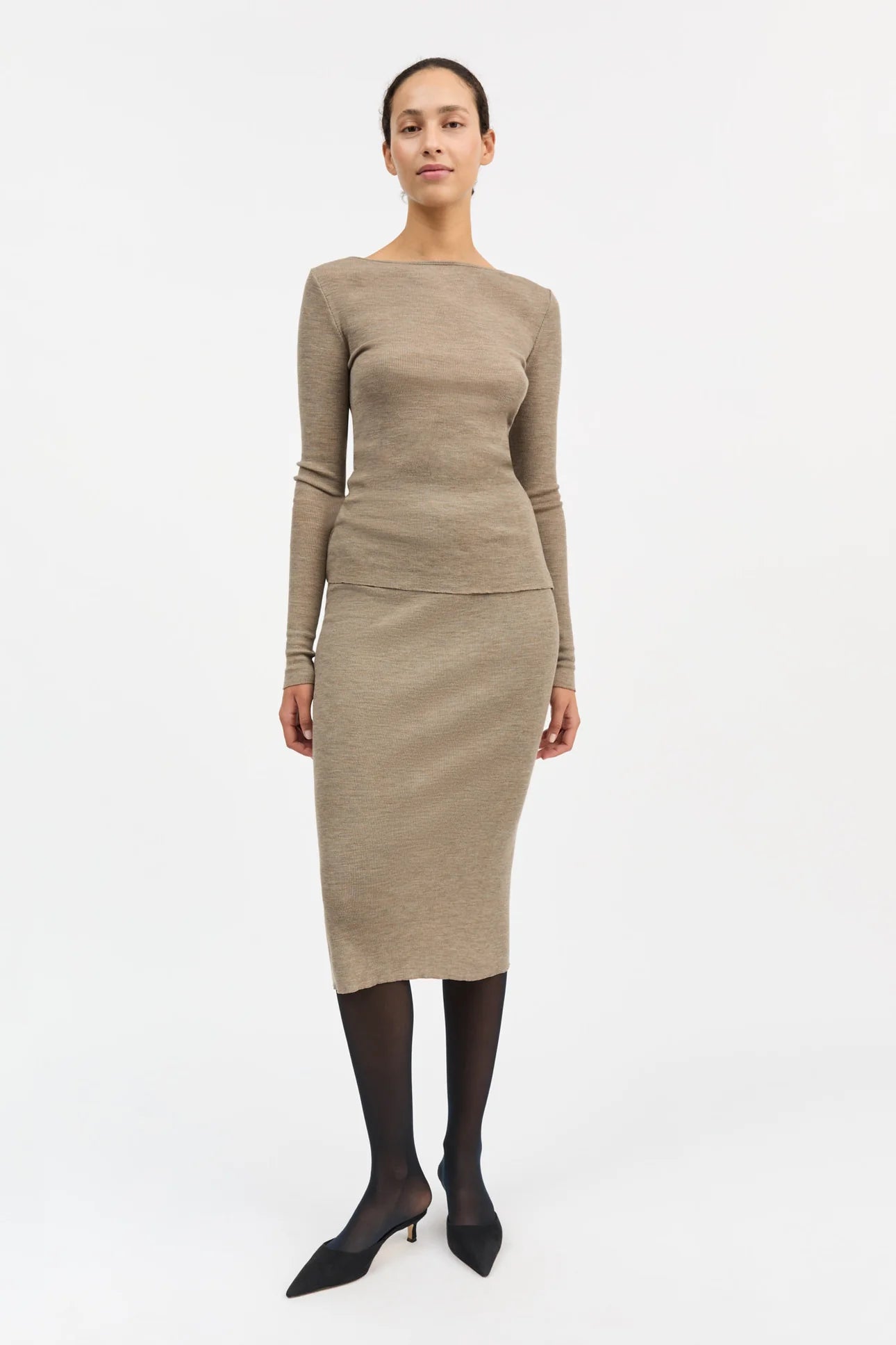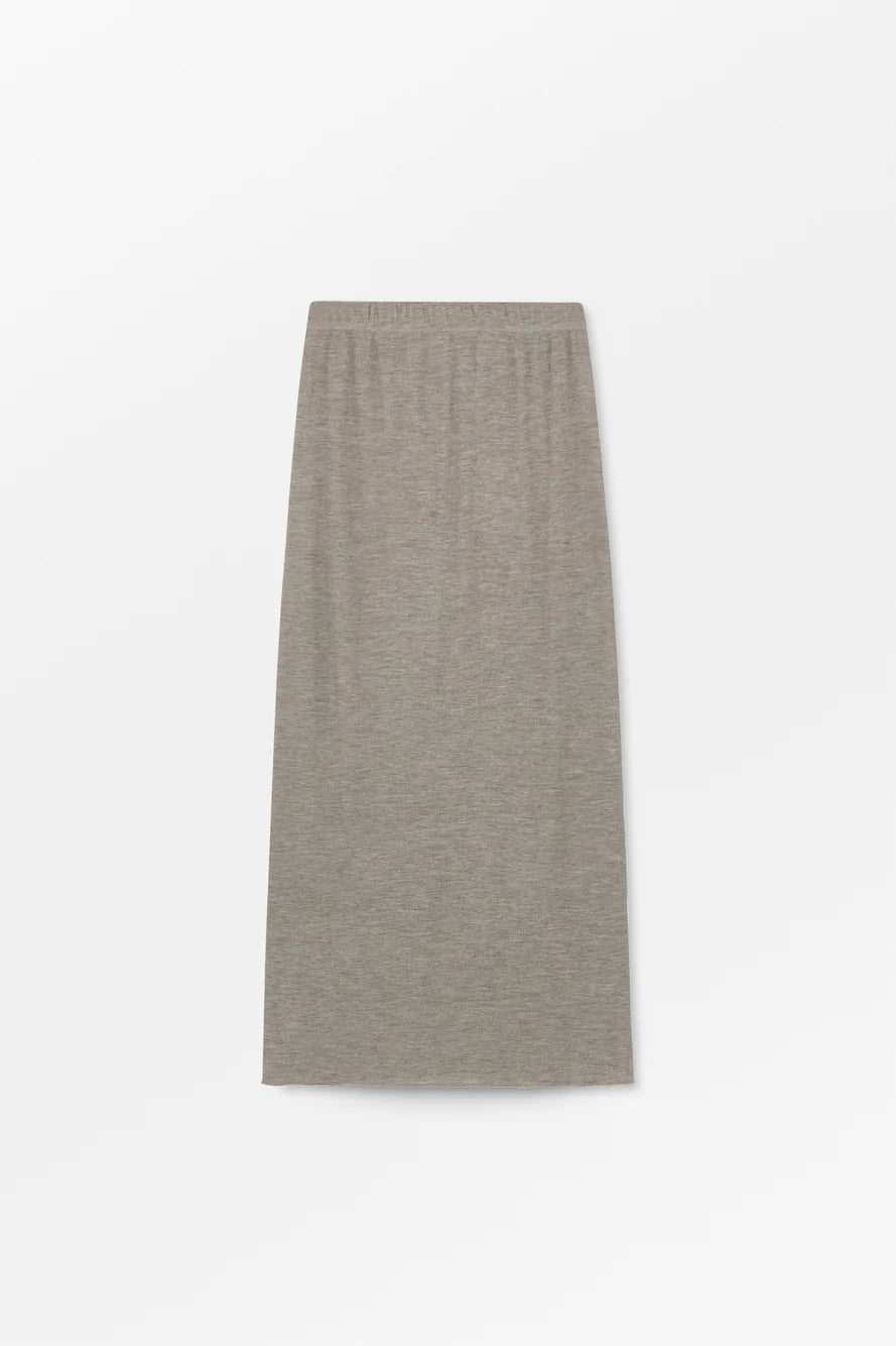 Amy Skirt er en let figursyet nederdel af 100% økologisk merinould i en fin ribstrik. Den har en elastisk linning i taljen og falder til midt på læggen.