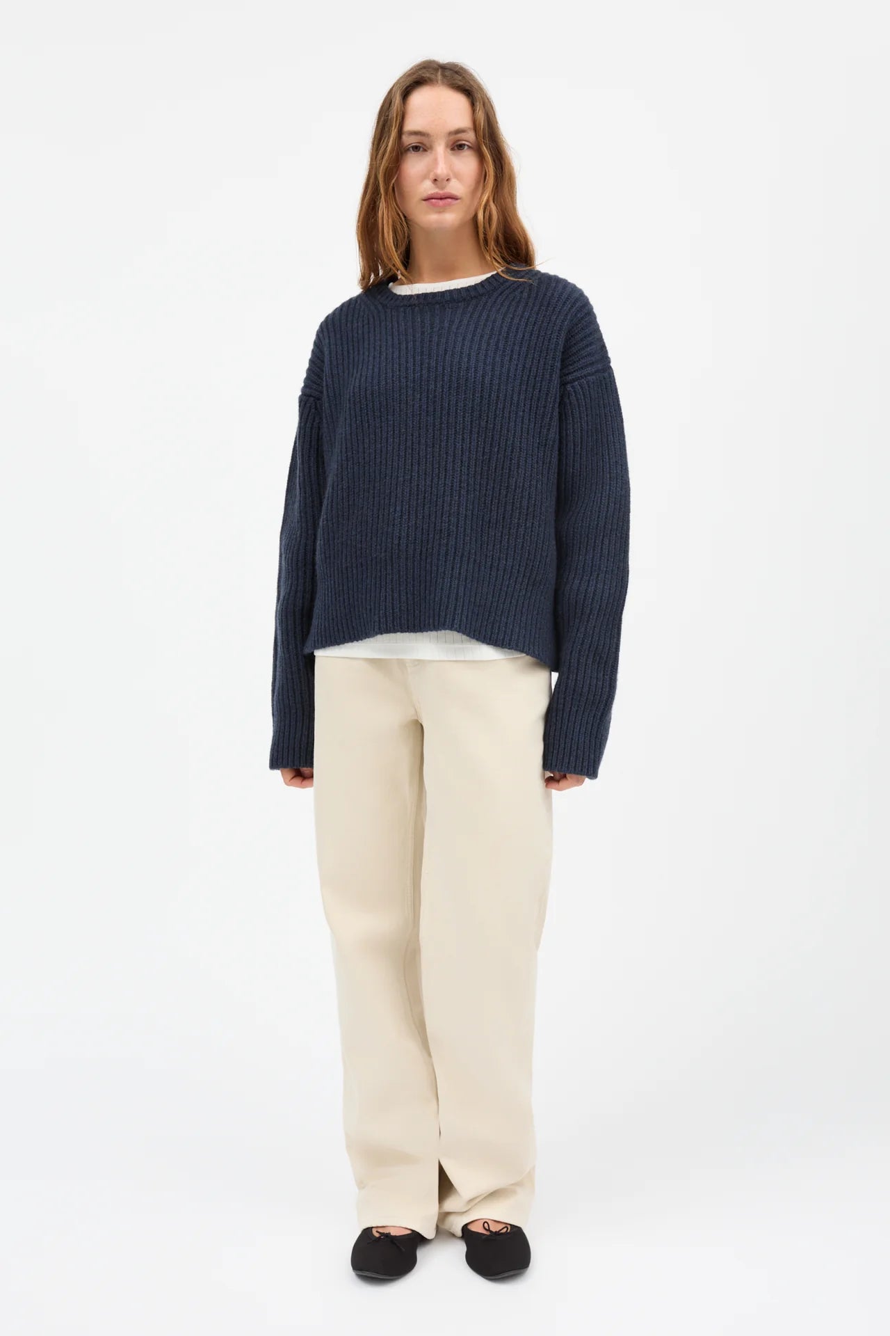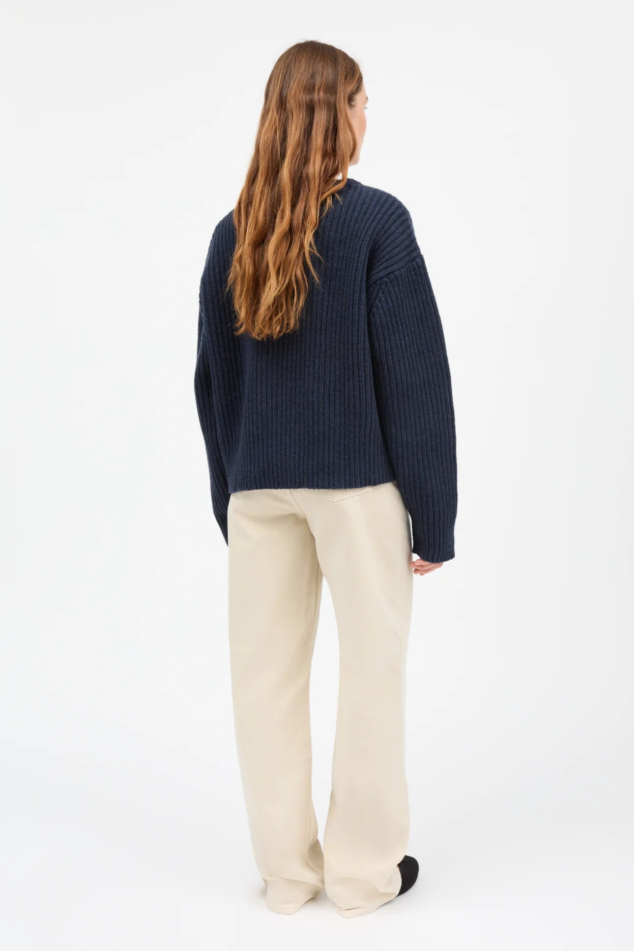 Diana Round Neck er en blød, afslappet sweater med rund hals, strikket i 100% uld. Den er ribstrikket med dobbelt ribkant ved halsen, lav skuldersøm og let voluminøse ærmer. Fine formstrikkede detaljer ved halsudskæringen foran og bagpå giver et diskret og luksuriøst udtryk.