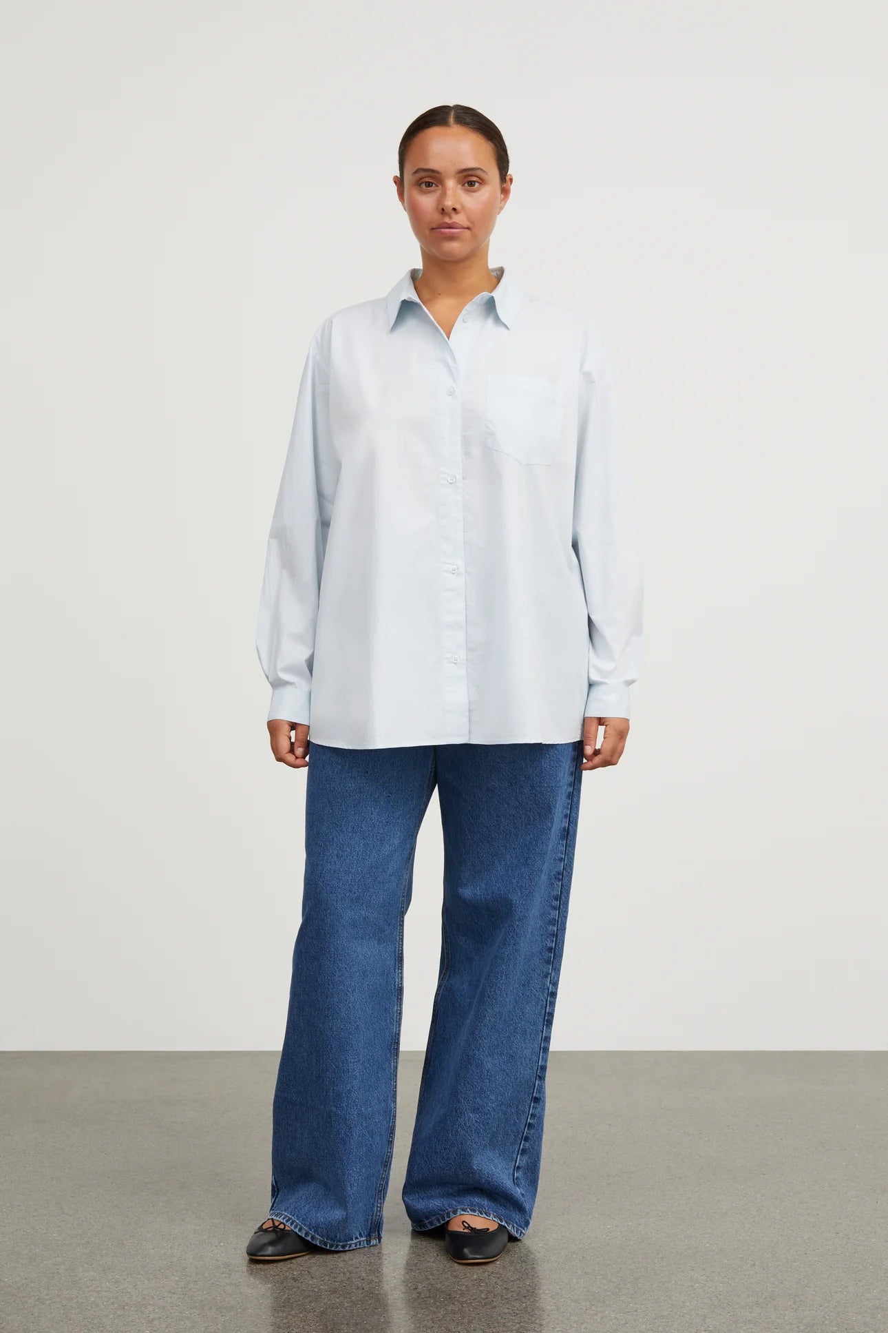 Edgar Shirt er en oversize, herreinspireret skjorte i økologisk bomuldspoplin. Skjorten har en almindelig krave, lange ærmer med knaplukning på manchetterne og lukkes med knapper hele vejen ned. Derudover har den en brystlomme og en bred læg i ryggen.