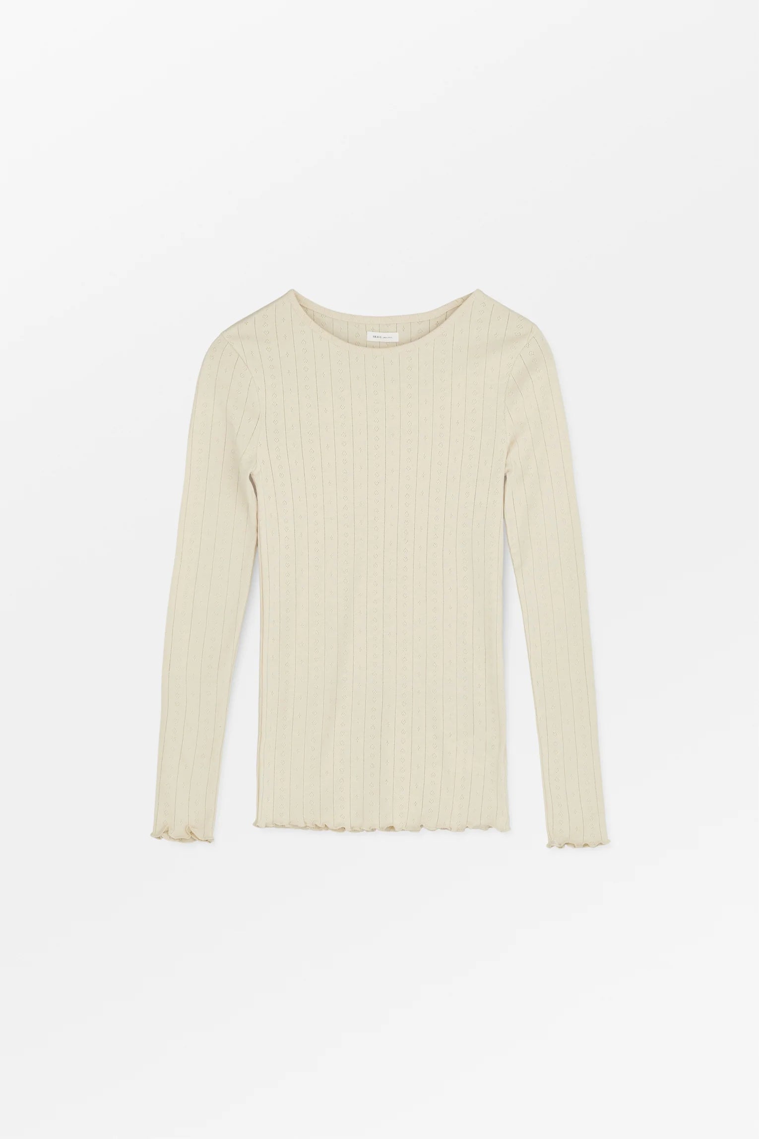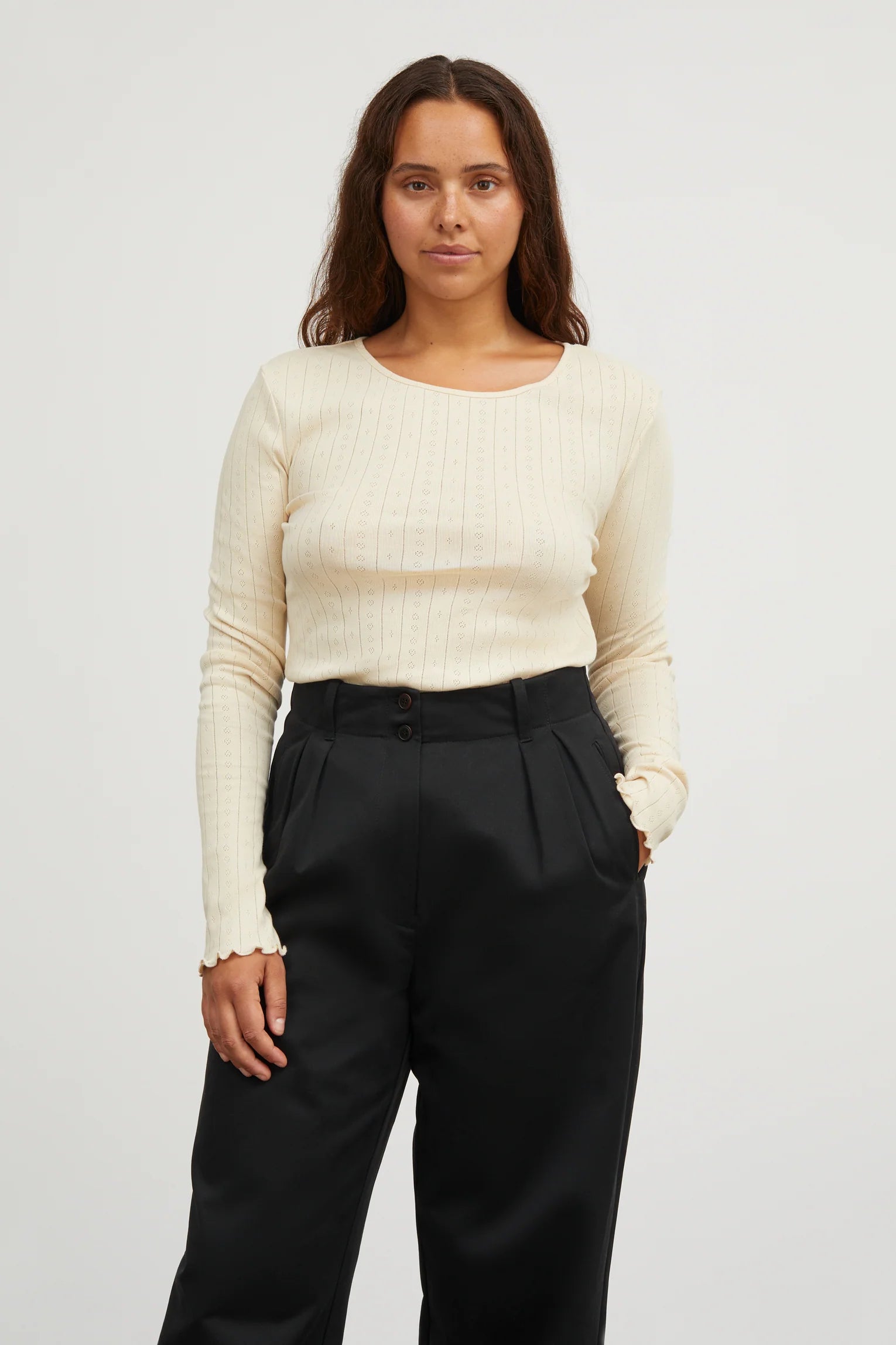 Med sin enkle runde hals og lange ærmer er Edie Blouse både klassisk og alsidig. Den tætsiddende pasform smyger sig til kroppen og giver et elegant udtryk, der fungerer perfekt til både hverdag og mere formelle lejligheder.