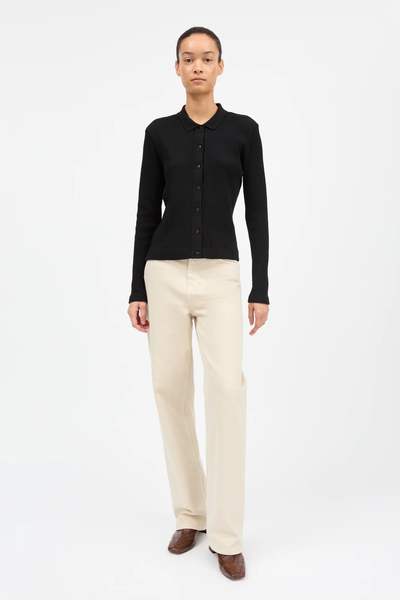 Eli Cardigan er en tætsiddende cardigan med klassisk poloinspireret krave. Den lukkes foran med syv knapper og er fremstillet i en let struktureret jersey. Dobbeltsyninger ved ærmer og kant giver et diskret, sporty udtryk.