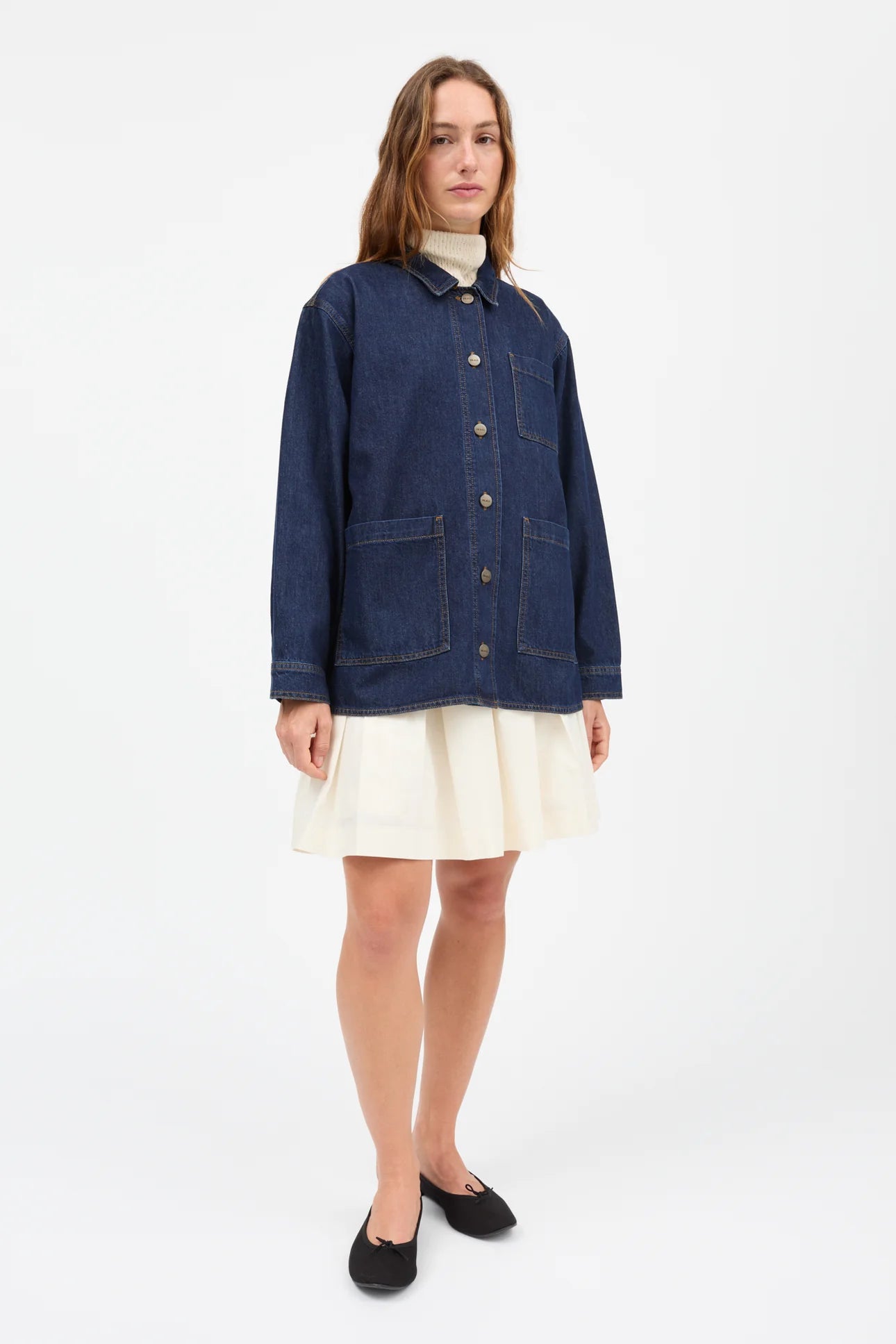 Henny Overshirt er en klassisk denimskjorte med lige snit og skjortekrave, inspireret af traditionelt workwear. Den har tre påsatte lommer foran, bærestykke bagpå og lukkes med metalknapper foran. Dobbeltsyninger omkring lommer, manchetter og langs fronten giver et funktionelt udtryk.