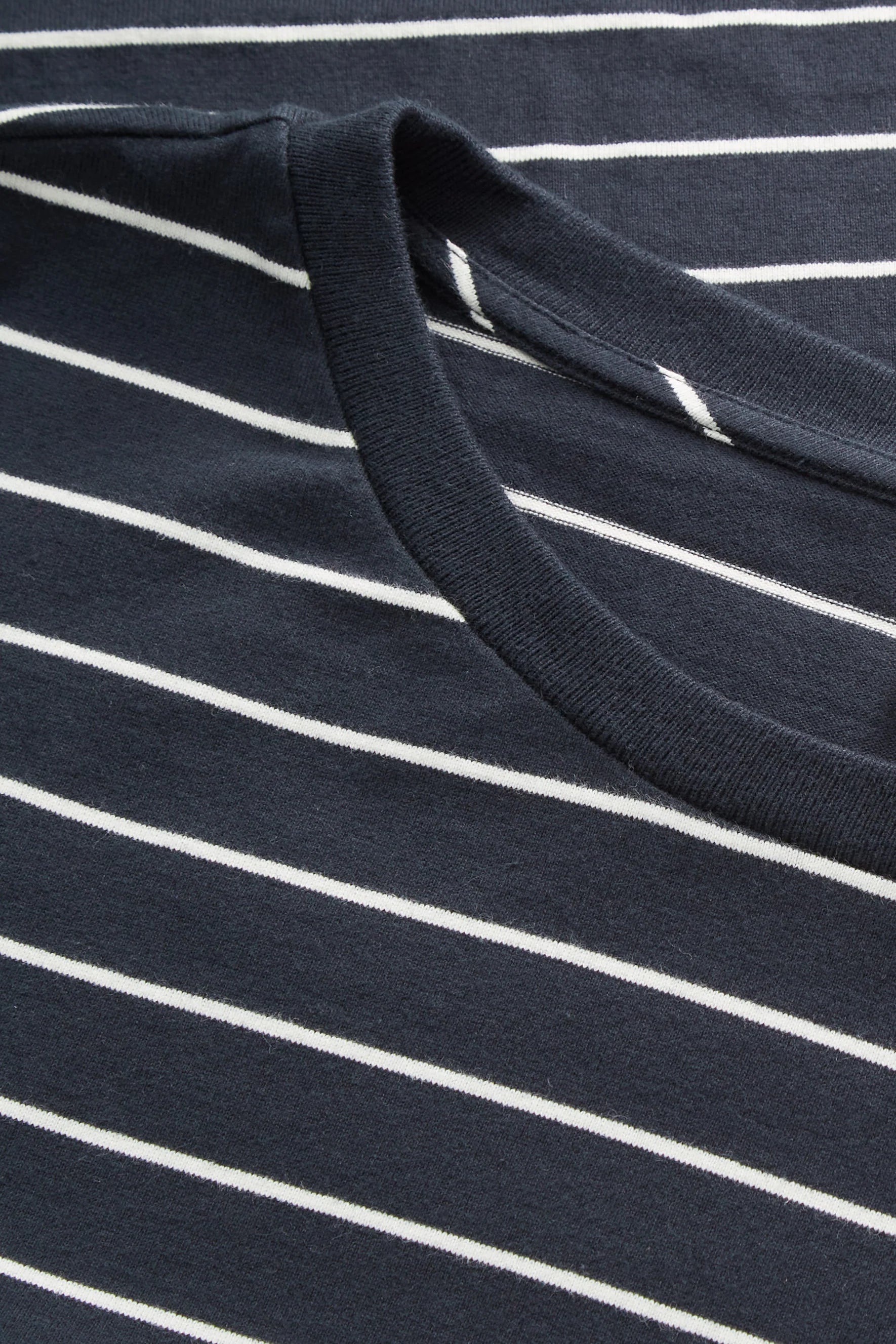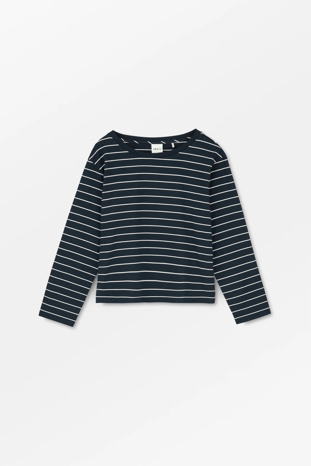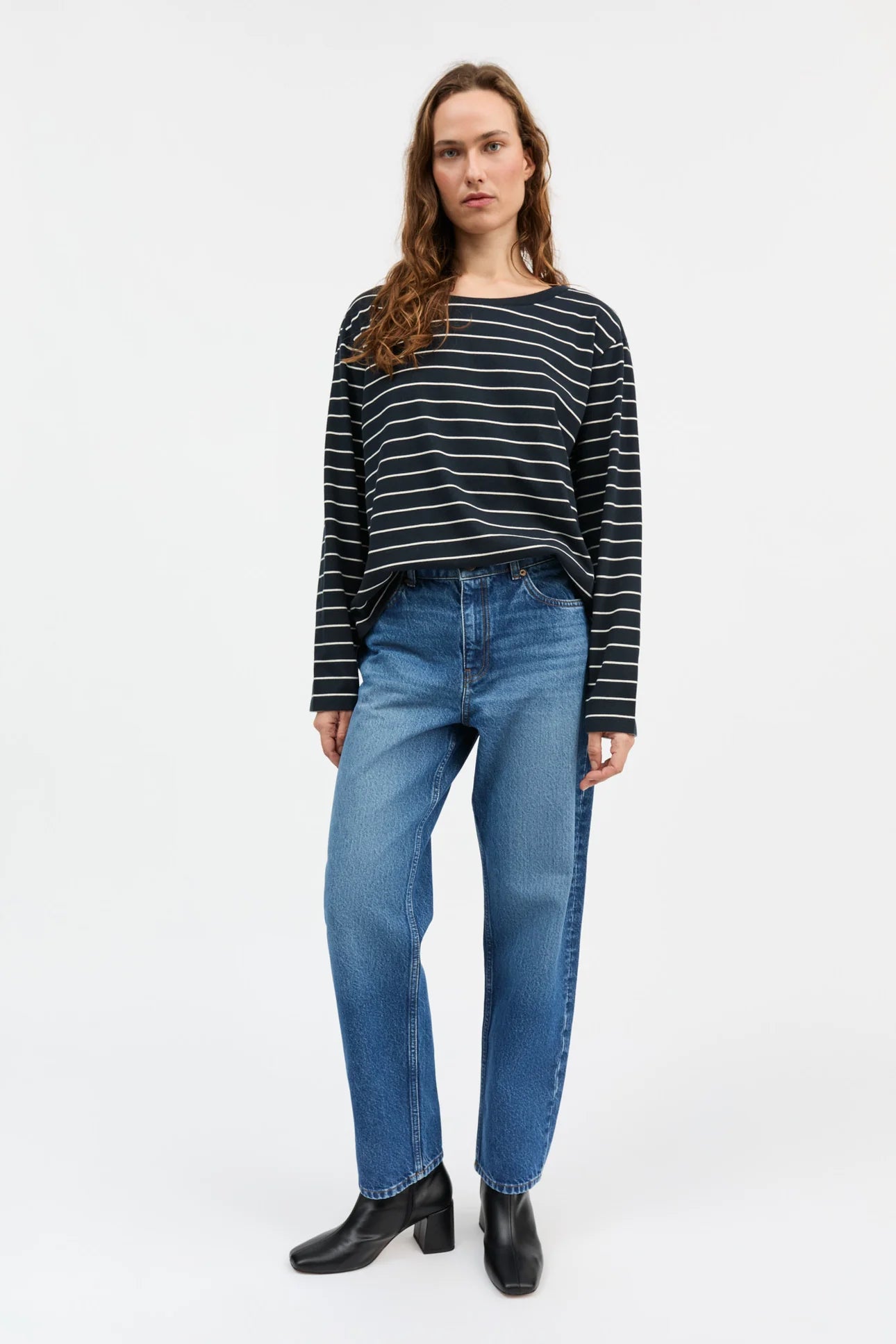 Loui Oversized Blouse er en langærmet, stribet bluse i kraftig økologisk bomuld. Blusen har en afslappet pasform og en bred rund hals med ribkant.