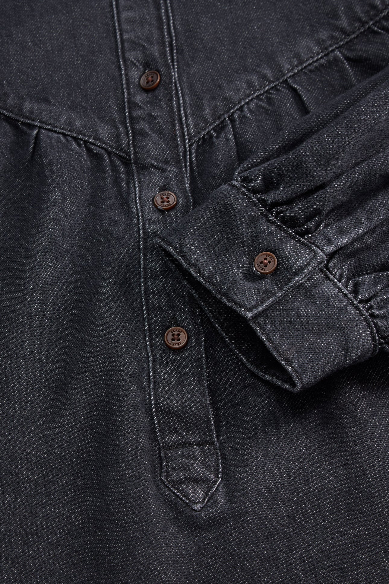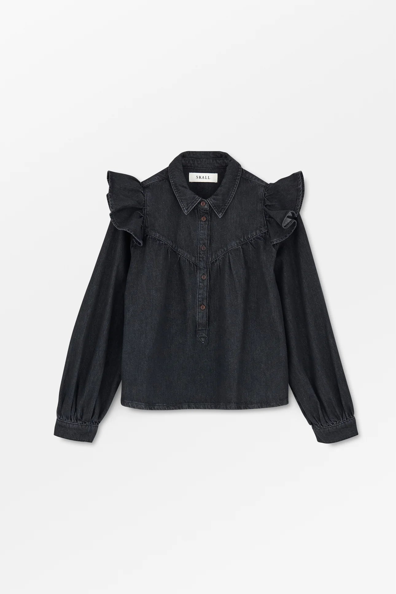 Mille Blouse i 100% økologisk bomuldsdenim har klassisk krave og en halv stolpelukning med fem små knapper. Små læg fra bærestykket giver vidde, og blusen har voluminøse ærmer, der samles i manchetter. To flæsekappeærmer fuldender den feminine silhuet.