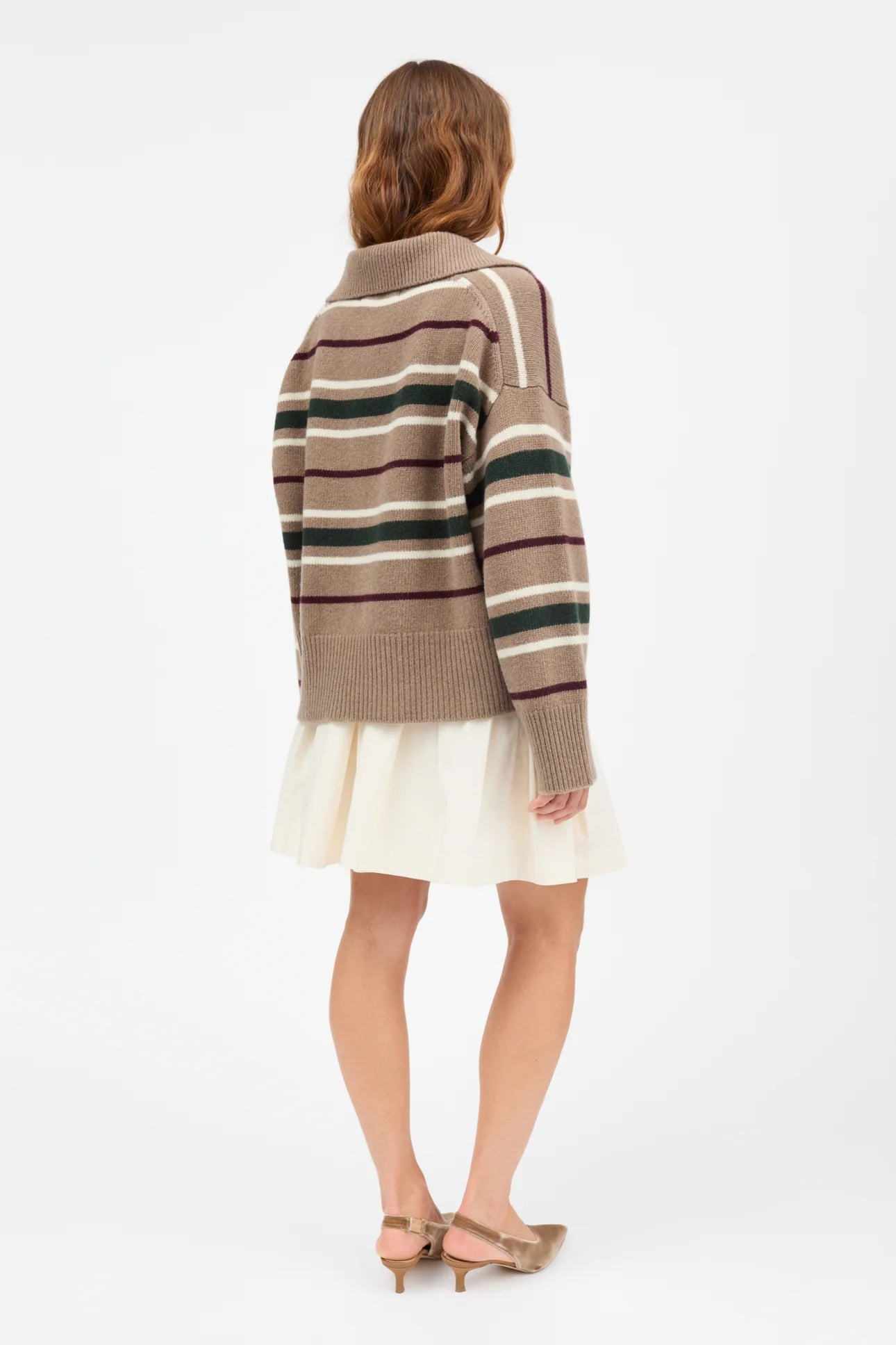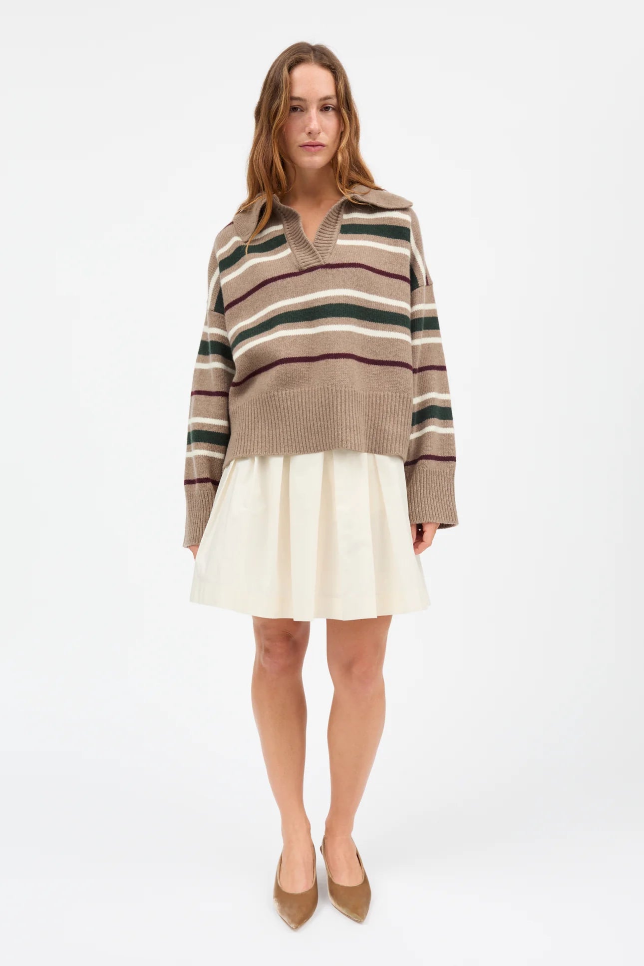 Paul V-Neck Jumper er en stribet sweater i 100% merinould med en bred, enkeltlags ribkrave og en blød, overlappende V-udskæring. Sweateren har en afslappet pasform med sænkede skuldre og raglanærme bagpå – en diskret detalje, der fremhæver den afslappede silhuet. Brede ribkanter afslutter manchetter og bund.