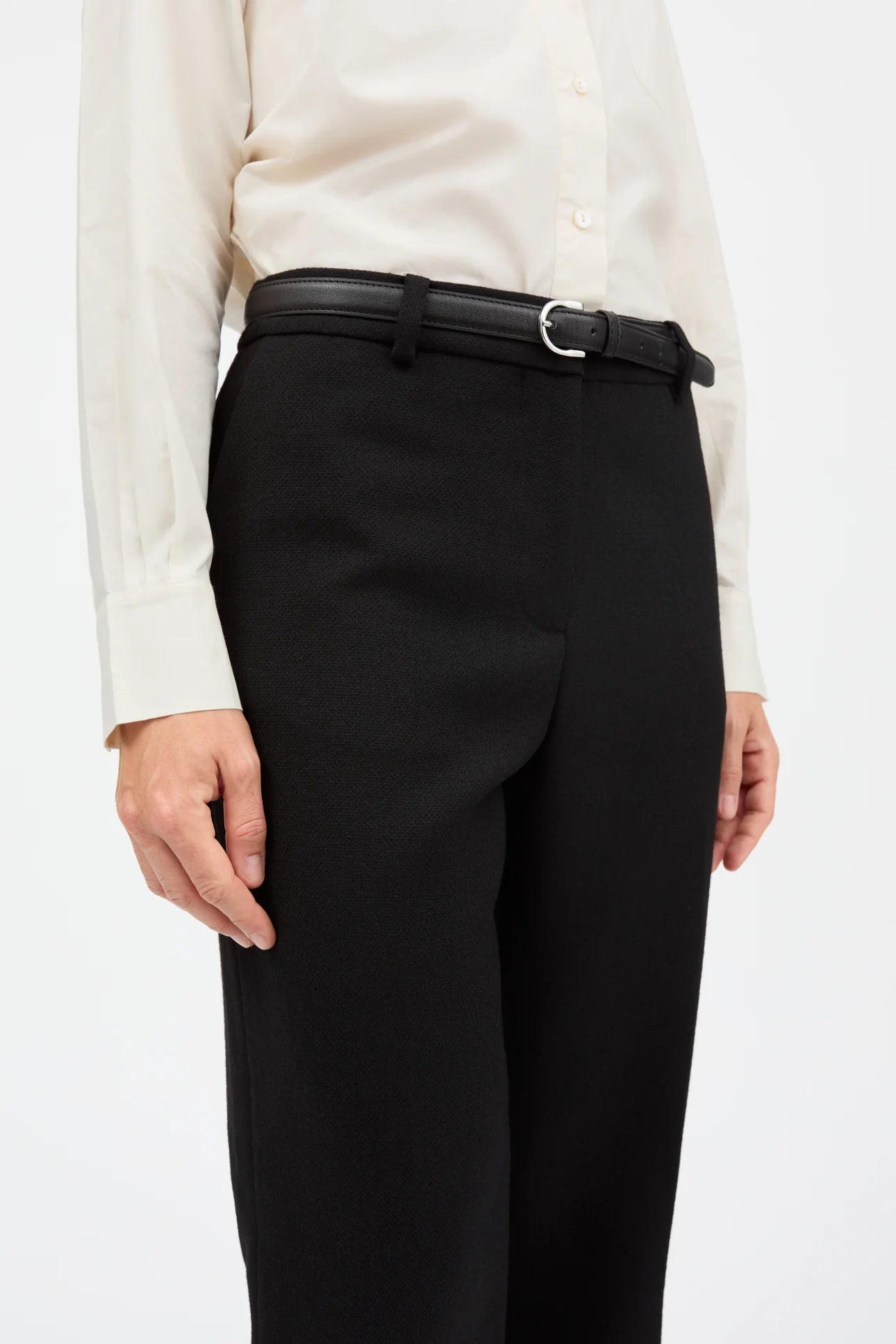 Wallace Trousers er et klassisk par bukser med lav talje, smalle hofter og let vidde ved anklerne. De lukkes med lynlås og dobbelt hægte og har skrålommer i siden samt en enkelt lomme bagpå. Bæltestropper og pressefolder foran fuldender det elegante udtryk.